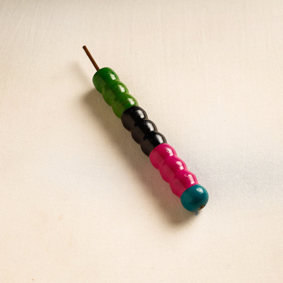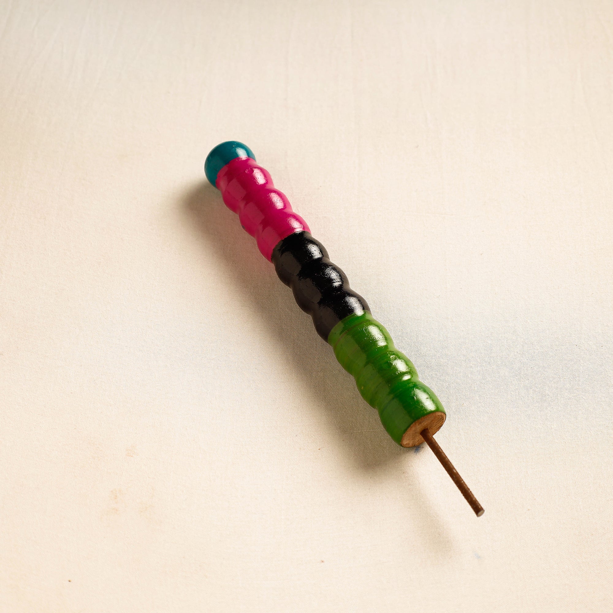 This handcrafted wooden wall hanger is made of babool wood with lacquered colours. This wall hanger meticulously handcrafted by skilled artisans from the Vadha community in villages like Nirona and Jura. They begin by selecting babool wood, which is known for its durability and strength. Layers of coloured lacquer are applied to the wood, and intricate designs and effects are chiselled to create a stunning visual appeal.