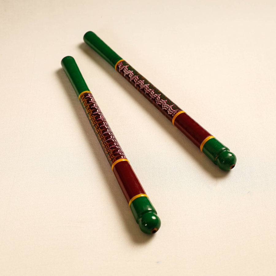 These exquisitely handcrafted garba dandiya sticks are made of babool wood with lacquered colours. These garba dandiya sticks are meticulously handcrafted by skilled artisans from the Vadha community in villages like Nirona and Jura. They begin by selecting babool wood, which is known for its durability and strength. Layers of coloured lacquer are applied to the wood, and intricate designs and effects are chiselled to create a stunning visual appeal.