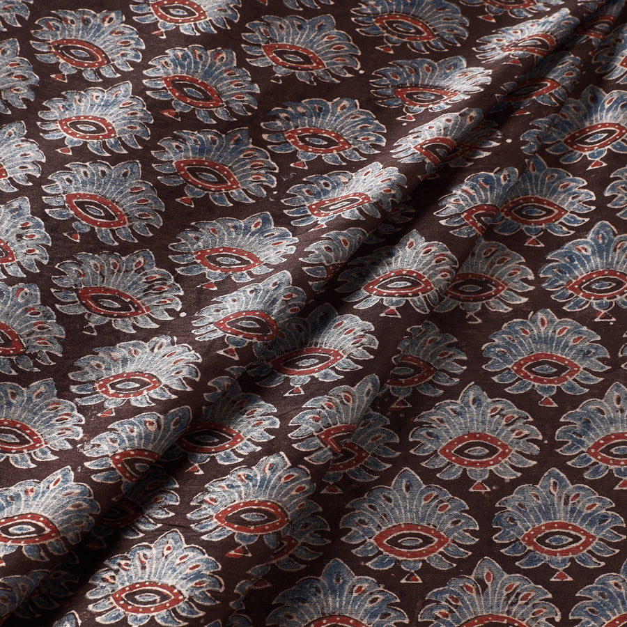 Fine quality brown aspen leaf design ajrakh hand block printed chanderi silk-cotton handloom fabric, made using natural dyes through traditional ajrakh technique of hand-block printing practised by the artisans in the kutch region of Gujarat. This traditional technique of vegetable dyeing and resist block-printing on cloth dates back 4,500 years and is the attire of the Maldhari pastoral community of Bhuj. With each layer of colour printed after a gap of time, this fabric requires a lot of time and care. The intricate patterns and vibrant colours on the chanderi fabric create a perfect blend of elegance and comfort, perfect for creating exquisite ethnic wear, sarees, and accessories.
