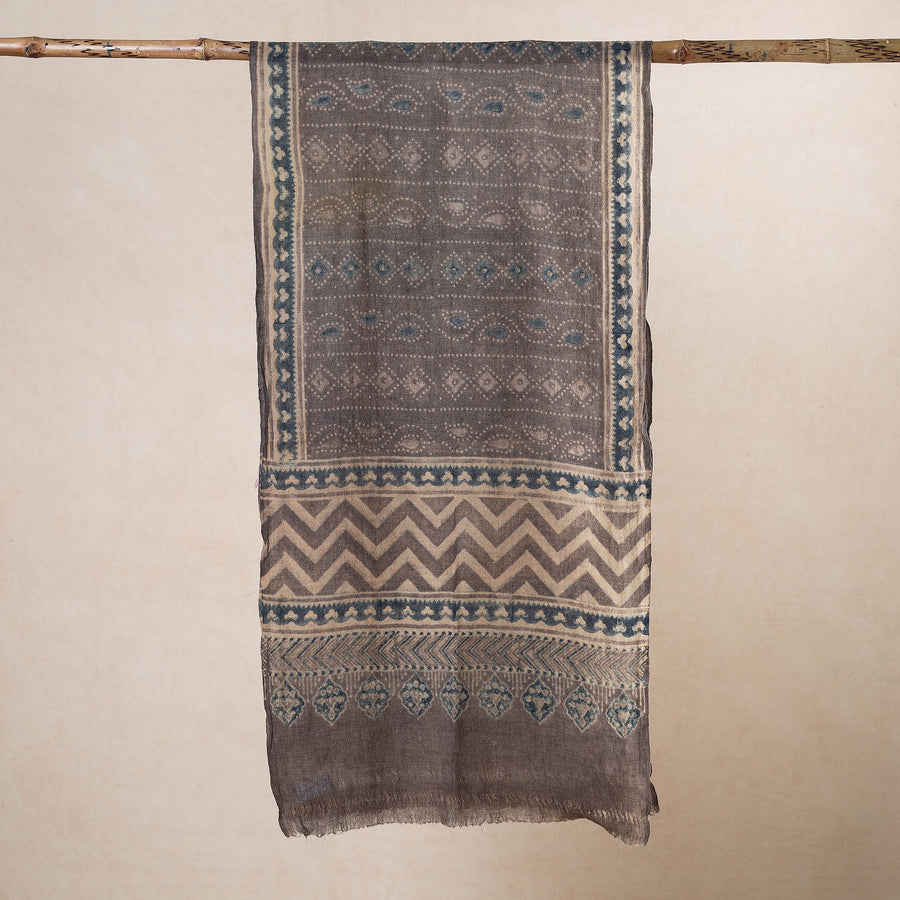 Elevate your style with this fine quality brown ajrakh hand block printed pure wool stole. This exquisite stole is made using natural dyes through the traditional techniques of hand block printing by skilled artisans in the Kutch region of Gujarat. The pure wool construction offers exceptional warmth and softness, making it perfect for cold weather. This exquisite stole can elevate any outfit. It's versatile, suitable for both formal and casual occasions, adding a touch of traditional Indian artistry to your style.