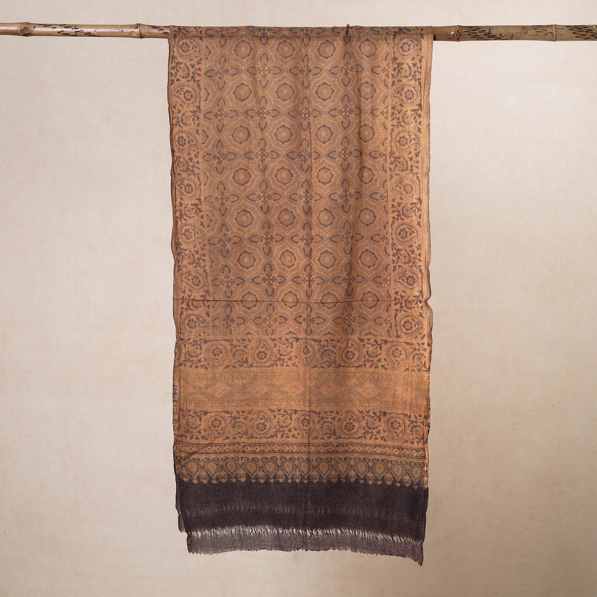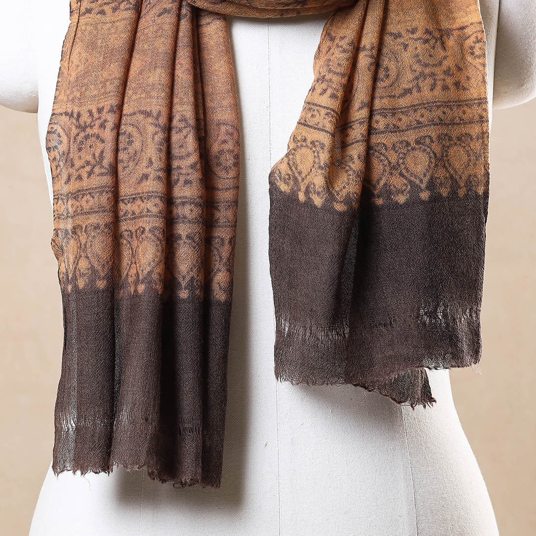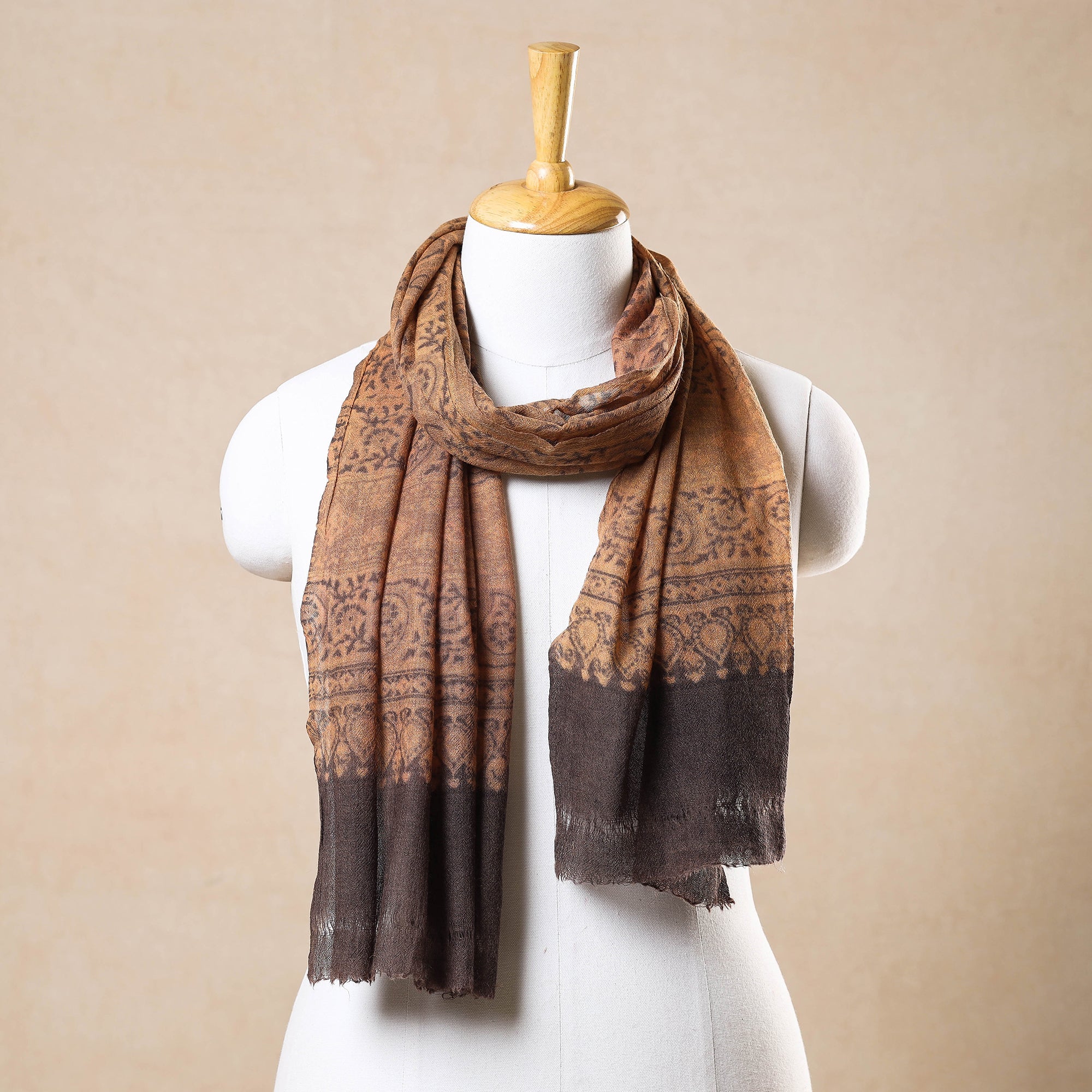 Elevate your style with this fine quality beige ajrakh hand block printed pure wool stole. This exquisite stole is made using natural dyes through the traditional techniques of hand block printing by skilled artisans in the Kutch region of Gujarat. The pure wool construction offers exceptional warmth and softness, making it perfect for cold weather. This exquisite stole can elevate any outfit. It's versatile, suitable for both formal and casual occasions, adding a touch of traditional Indian artistry to your style.