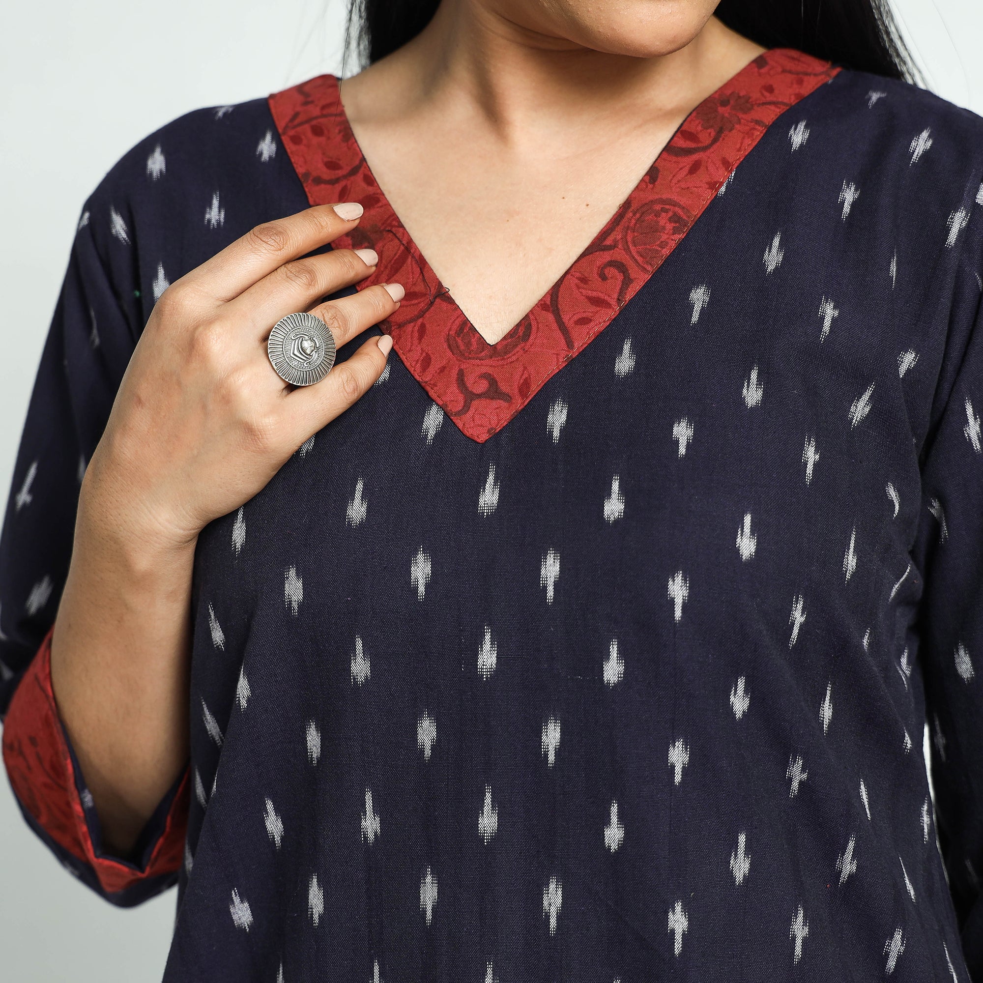 Experience the beauty of Indian Ikat with this pochampally ikat weave Patchwork cotton long kurta. .The vibrant ikat patterns in beautiful colours make it a standout piece. With its long length and side pocket, it combines style and functionality. It boasts an exquisite modal silk patchwork design, adding a touch of elegance to your ensemble With its comfortable fit and unique detailing, this kurta is perfect for your daily outing and for a special occasion.