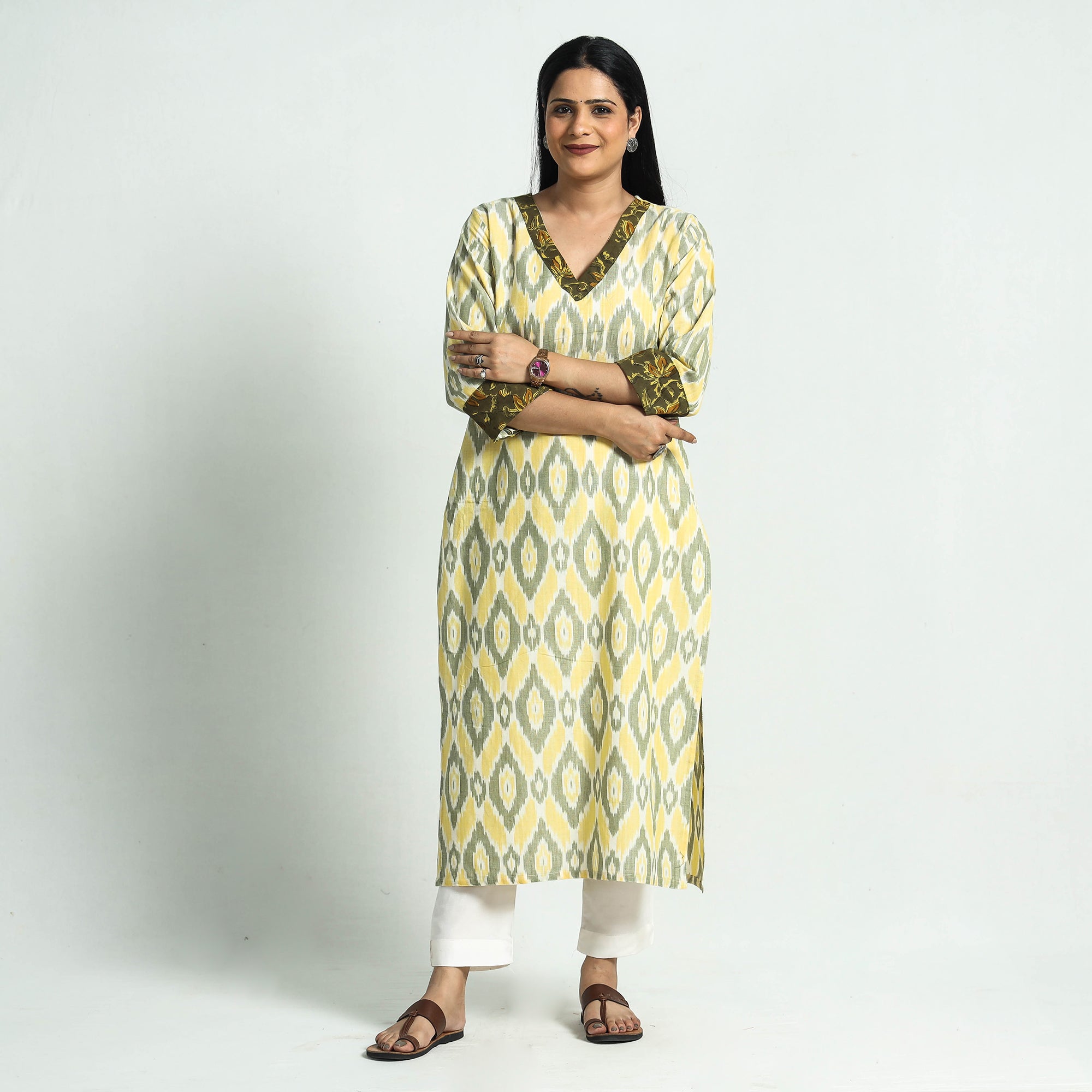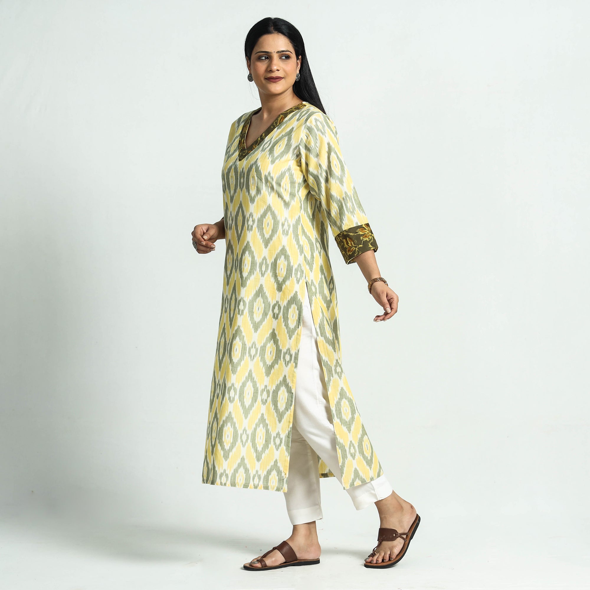 Experience the beauty of Indian Ikat with this pochampally ikat weave Patchwork cotton long kurta. .The vibrant ikat patterns in beautiful colours make it a standout piece. With its long length and side pocket, it combines style and functionality. It boasts an exquisite mangalgiri patchwork design, adding a touch of elegance to your ensemble With its comfortable fit and unique detailing, this kurta is perfect for your daily outing and for a special occasion.