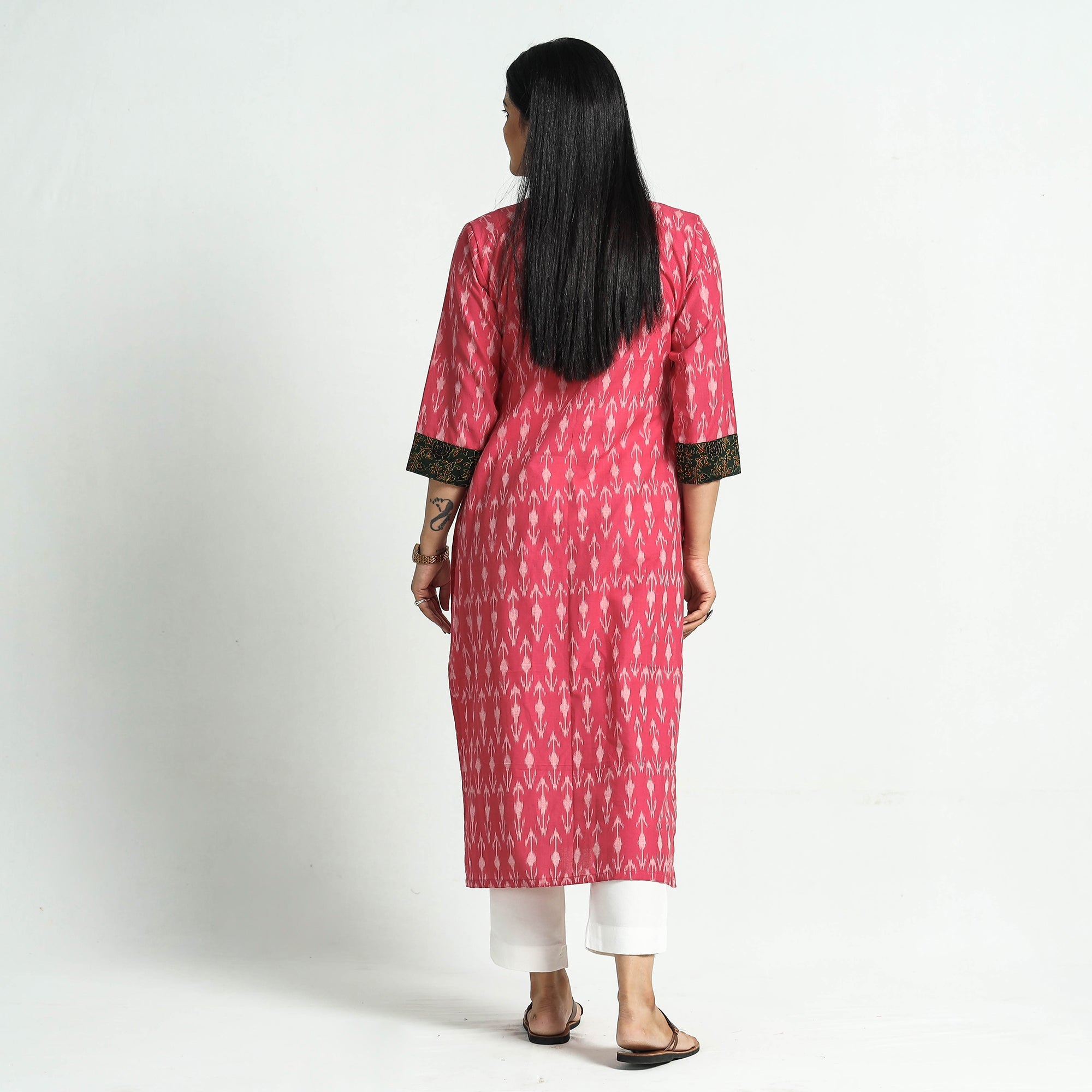 Experience the beauty of Indian Ikat with this pochampally ikat weave Patchwork cotton long Kurta. .The vibrant ikat patterns in beautiful colours make it a standout piece. With its long length and side pocket, it combines style and functionality. It boasts an exquisite modal silk patchwork design, adding a touch of elegance to your ensemble With its comfortable fit and unique detailing, this Kurta is perfect for your daily outing and for a special occasion.