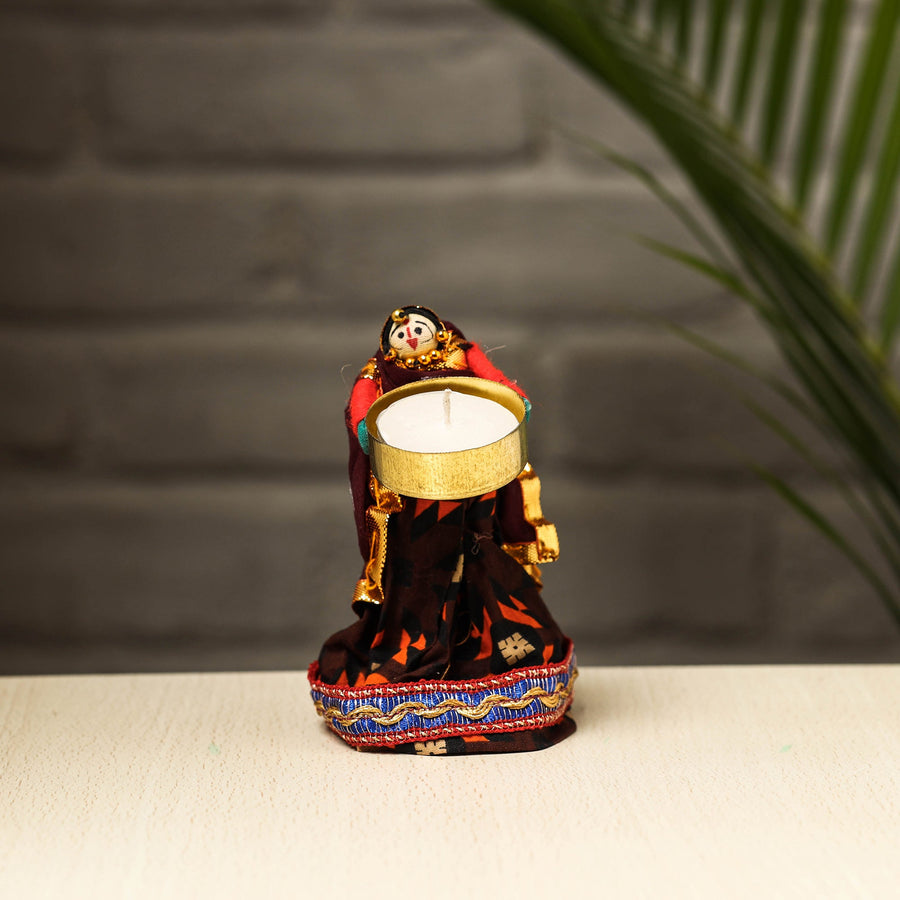 Elevate your decor with our exquisite Rajasthani puppet couple tealight candle holders. Meticulously handcrafted from wood, adorned with vibrant cotton fabric, and embellished with intricate gota patti work, these holders add a touch of Rajasthan's rich heritage to your home. Perfect for creating a warm, inviting ambiance, they're a charming addition to any space and make for a unique gifting option.