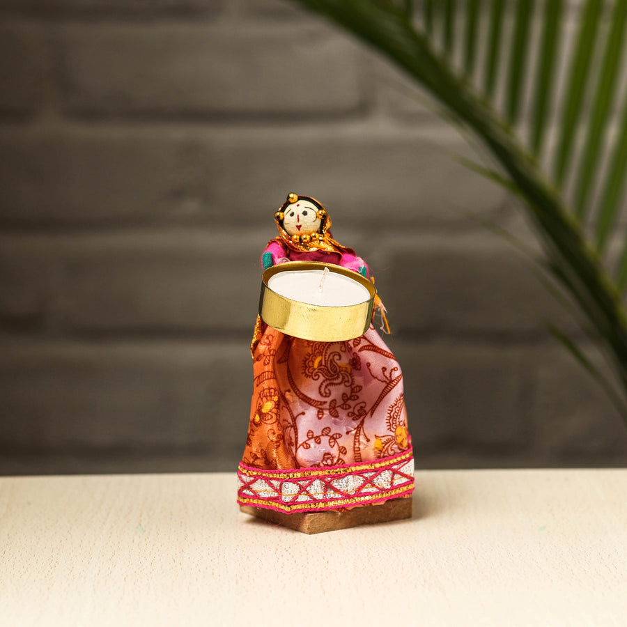 Material Elevate your decor with our exquisite Rajasthani puppet couple tealight candle holders. Meticulously handcrafted from wood, adorned with vibrant cotton fabric, and embellished with intricate gota patti work, these holders add a touch of Rajasthan's rich heritage to your home. Perfect for creating a warm, inviting ambiance, they're a charming addition to any space and make for a unique gifting option.