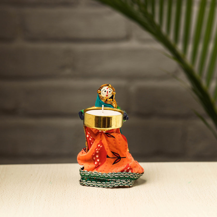 Elevate your decor with our exquisite Rajasthani puppet couple tealight candle holders. Meticulously handcrafted from wood, adorned with vibrant cotton fabric, and embellished with intricate gota patti work, these holders add a touch of Rajasthan's rich heritage to your home. Perfect for creating a warm, inviting ambiance, they're a charming addition to any space and make for a unique gifting option.