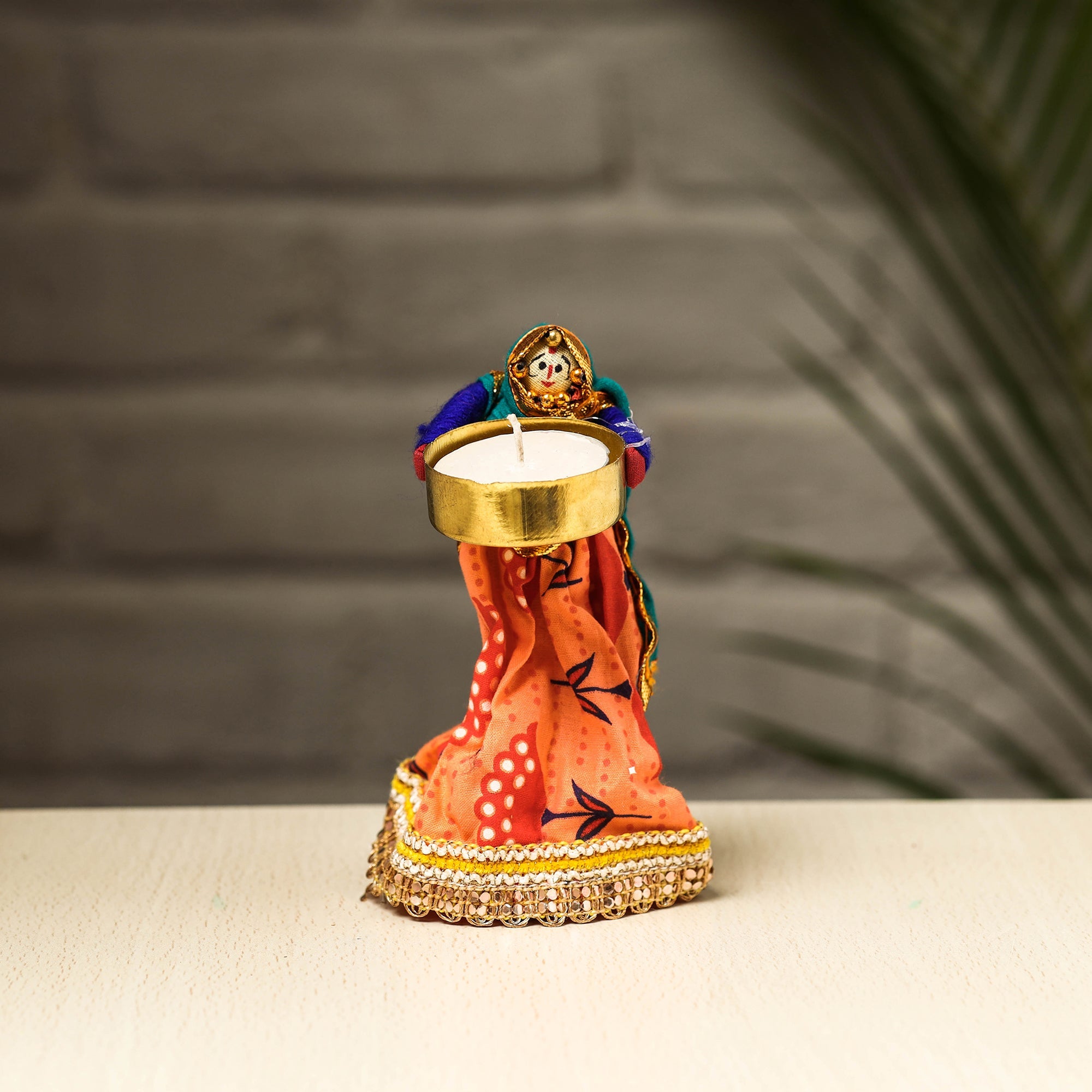 Elevate your decor with our exquisite Rajasthani puppet couple tealight candle holders. Meticulously handcrafted from wood, adorned with vibrant cotton fabric, and embellished with intricate gota patti work, these holders add a touch of Rajasthan's rich heritage to your home. Perfect for creating a warm, inviting ambiance, they're a charming addition to any space and make for a unique gifting option.