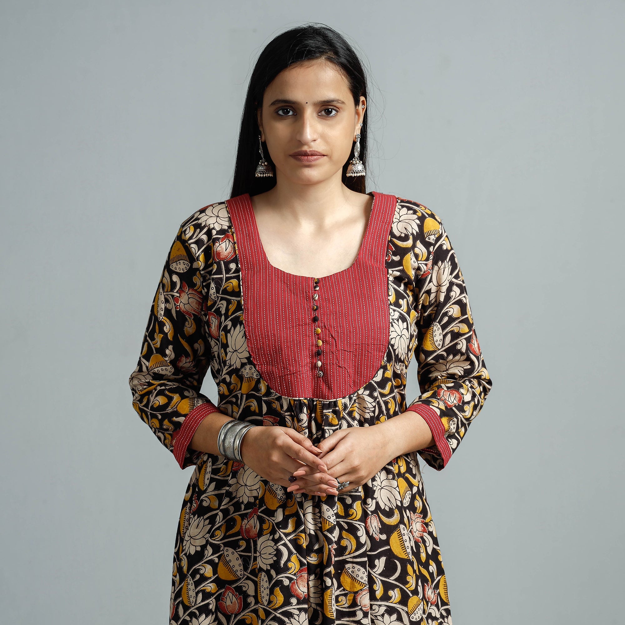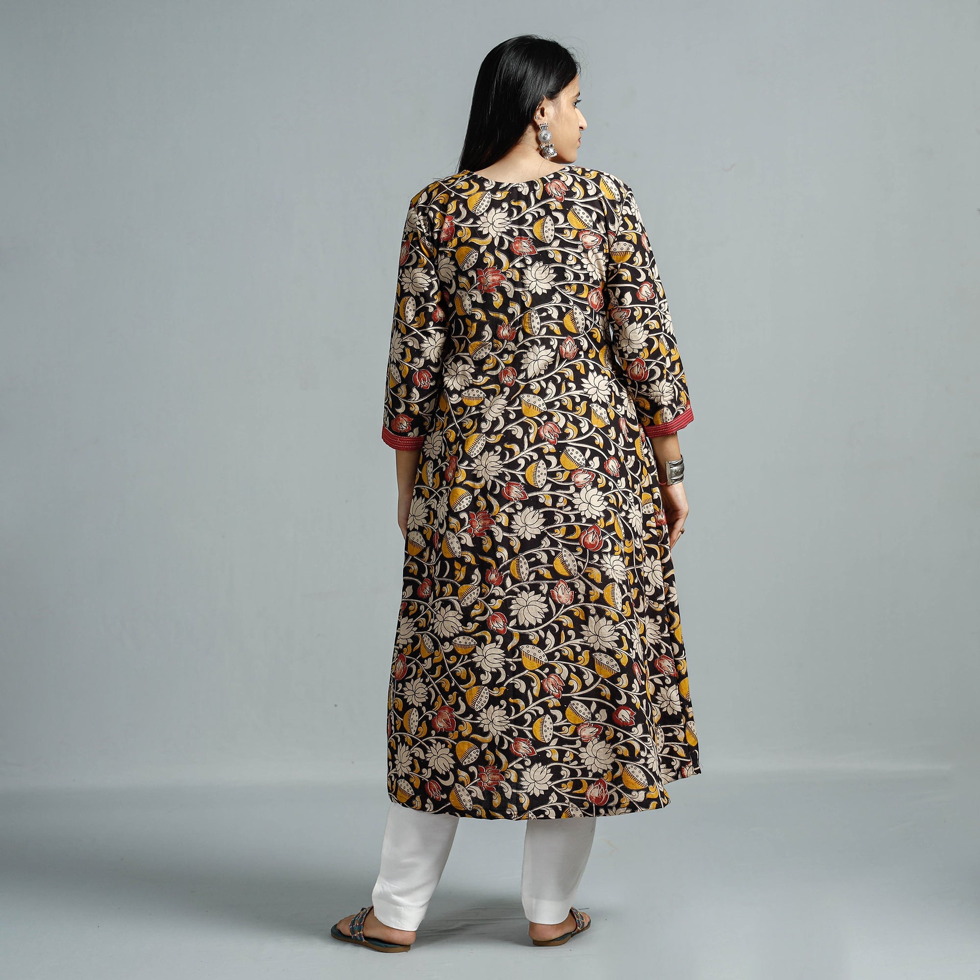 Look and feel beautiful in this uniquely designed cotton printed flared kalamkari kurta with a side pocket. Kalamkari is the earliest and most complex technique of printing. This kurta is perfect for your daily outing and for a special occasion.