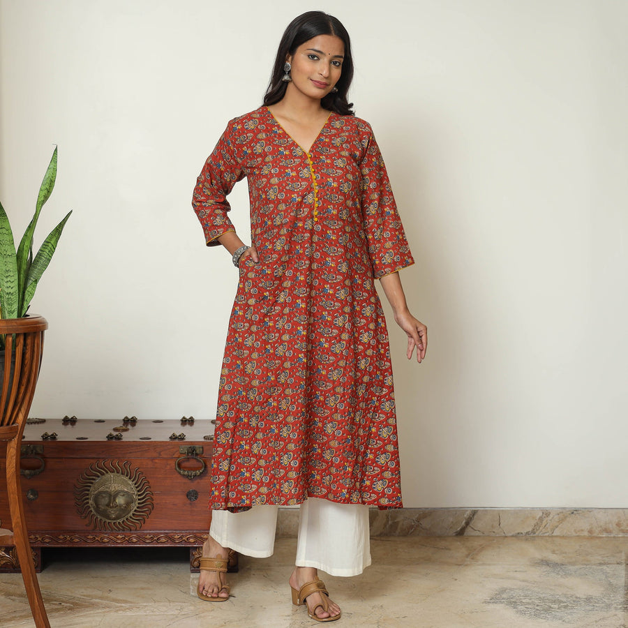 Look and feel beautiful in this uniquely designed cotton kalamkari-printed a-line kurta with a side pocket. Kalamkari is the earliest and most complex technique of printing. This kurta is perfect for your daily outing and for a special occasion.