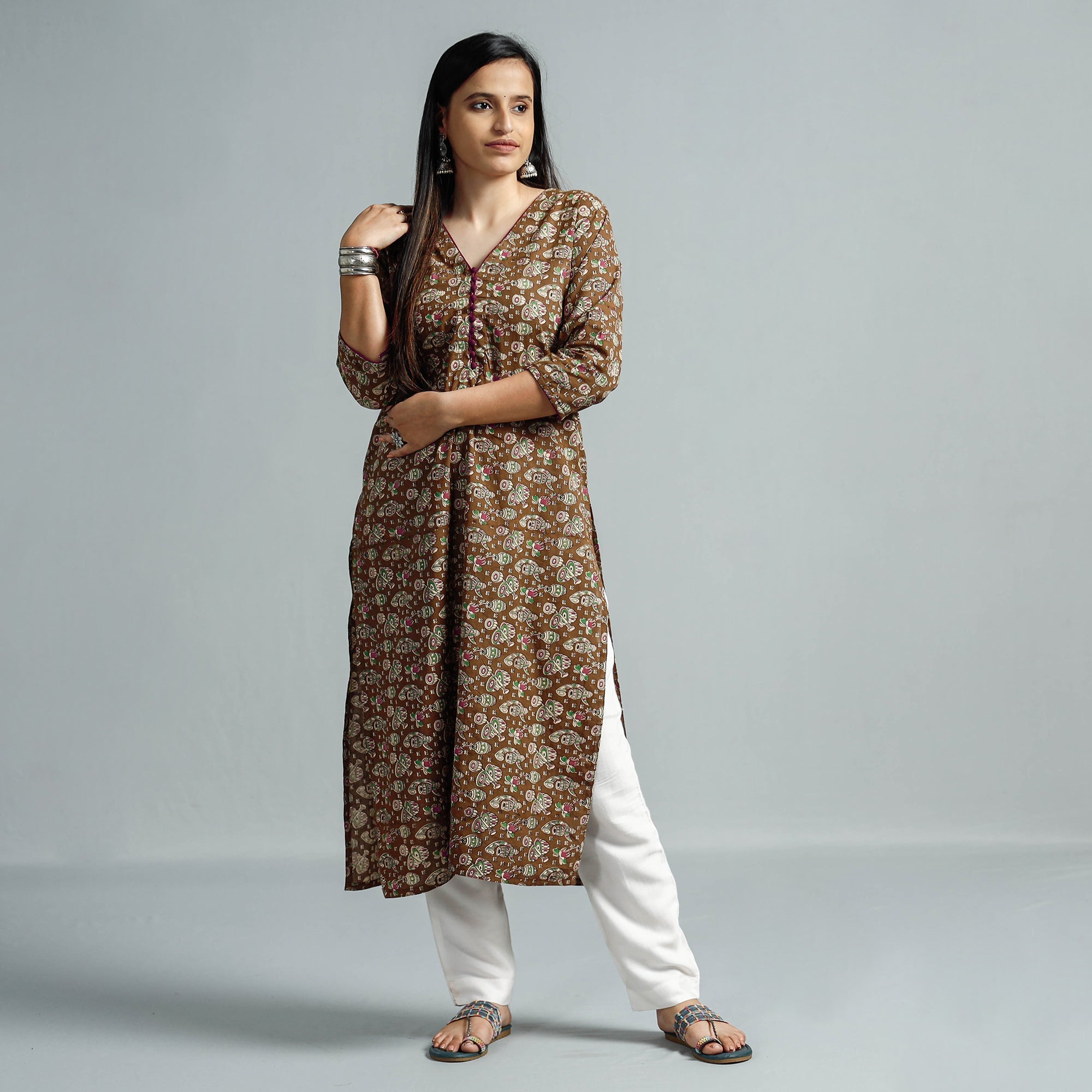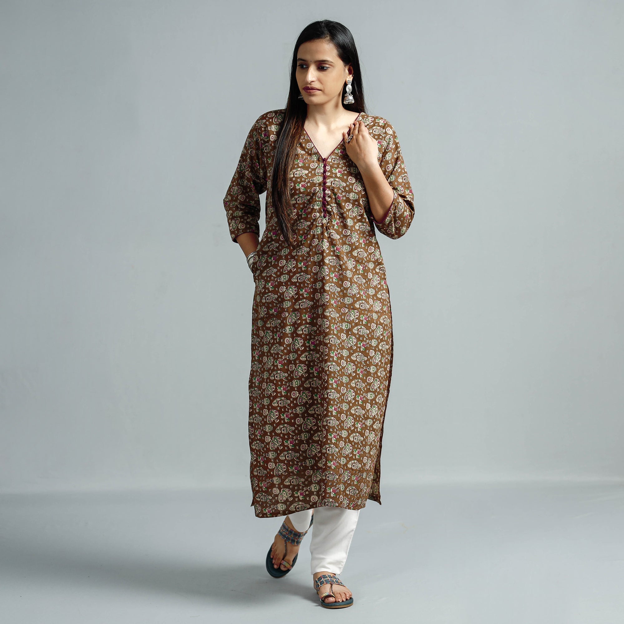 Look and feel beautiful in this uniquely designed cotton printed straight kalamkari kurta with a side pocket. Kalamkari is the earliest and most complex technique of printing. This kurta is perfect for your daily outing and for a special occasion.