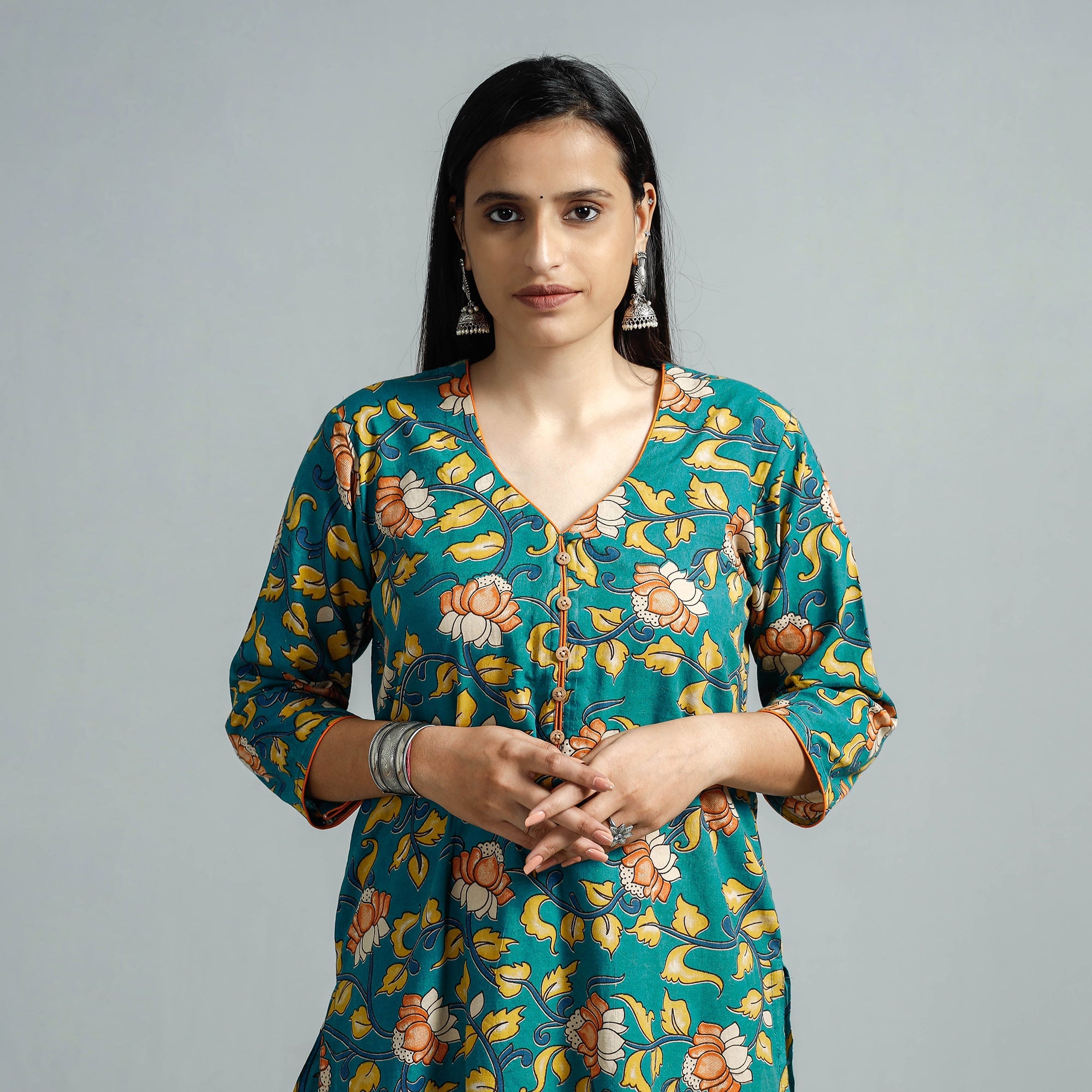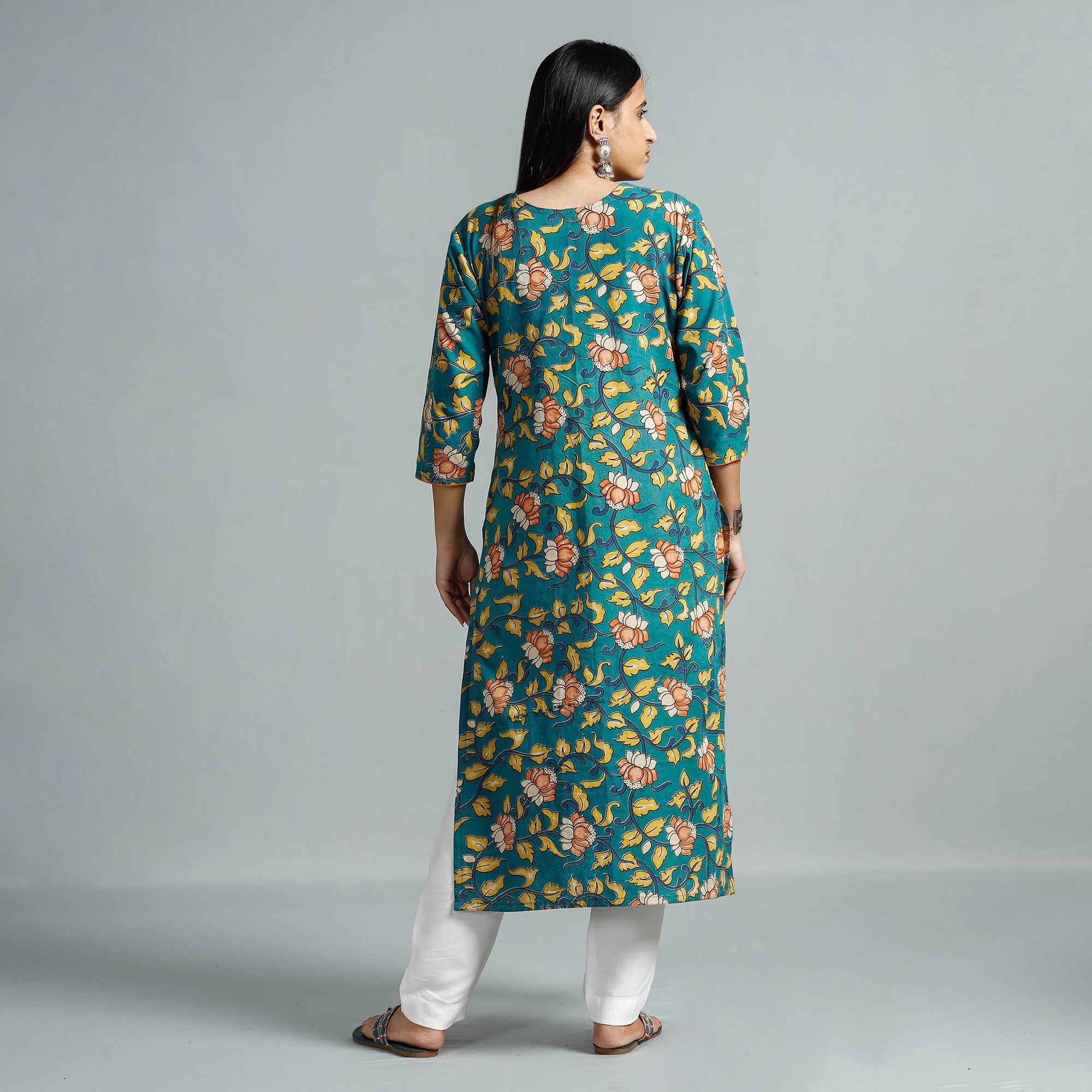 Look and feel beautiful in this uniquely designed cotton printed straight kalamkari kurta with a side pocket. Kalamkari is the earliest and most complex technique of printing. This kurta is perfect for your daily outing and for a special occasion.