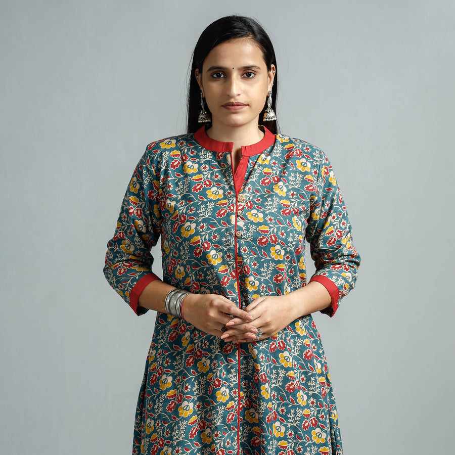 Look and feel beautiful in this uniquely designed cotton printed flared kalamkari kurta with a side pocket. Kalamkari is the earliest and most complex technique of printing. This kurta is perfect for your daily outing and for a special occasion.