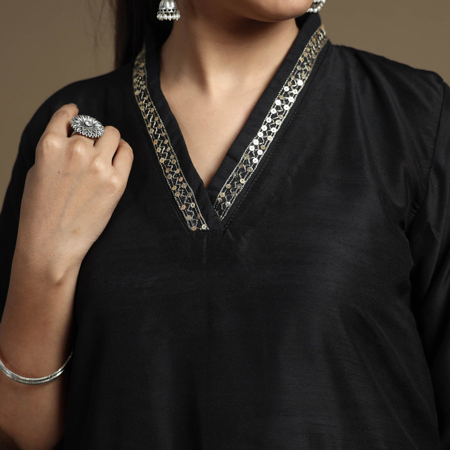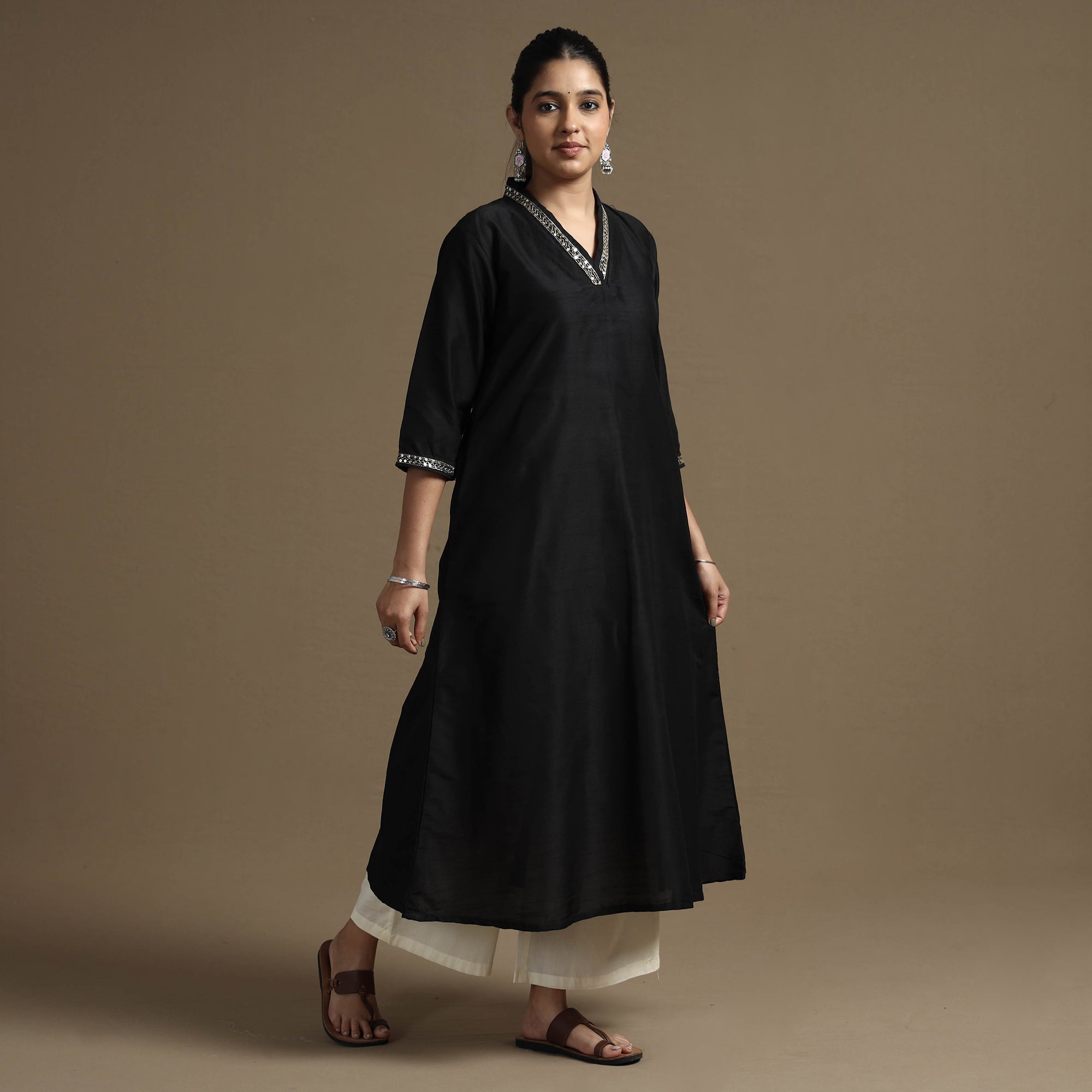 Look and feel beautiful in this uniquely designed plain solid slub silk long kurta. This kurta is crafted from high-quality slub silk fabric, ensuring a luxurious and comfortable feel against your skin. It boasts an exquisite beadwork lace design, adding a touch of elegance to your ensemble. The kurta also features a convenient one-side pocket, perfect for carrying small essentials. It's an ideal choice for both casual and festive occasions.