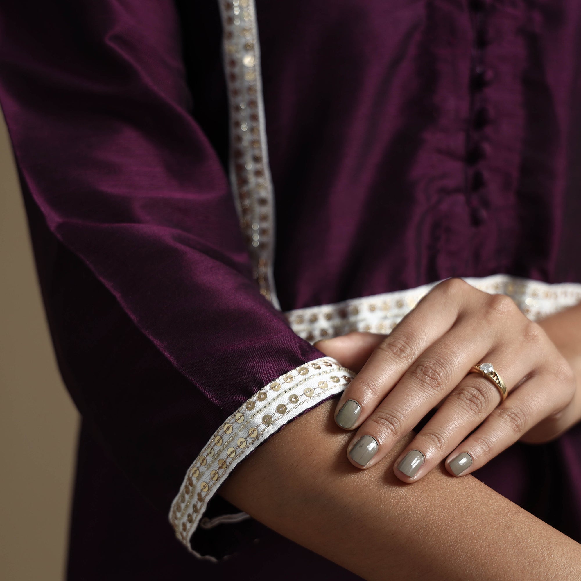 Look and feel beautiful in this uniquely designed plain solid slub silk long kurta. This kurta is crafted from high-quality slub silk fabric, ensuring a luxurious and comfortable feel against your skin. It boasts an exquisite beadwork lace design, adding a touch of elegance to your ensemble. The kurta also features a convenient one-side pocket, perfect for carrying small essentials. It's an ideal choice for both casual and festive occasions.