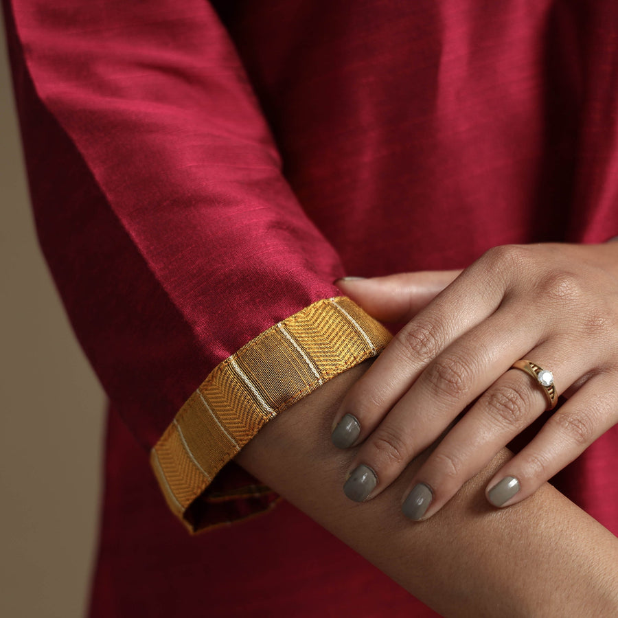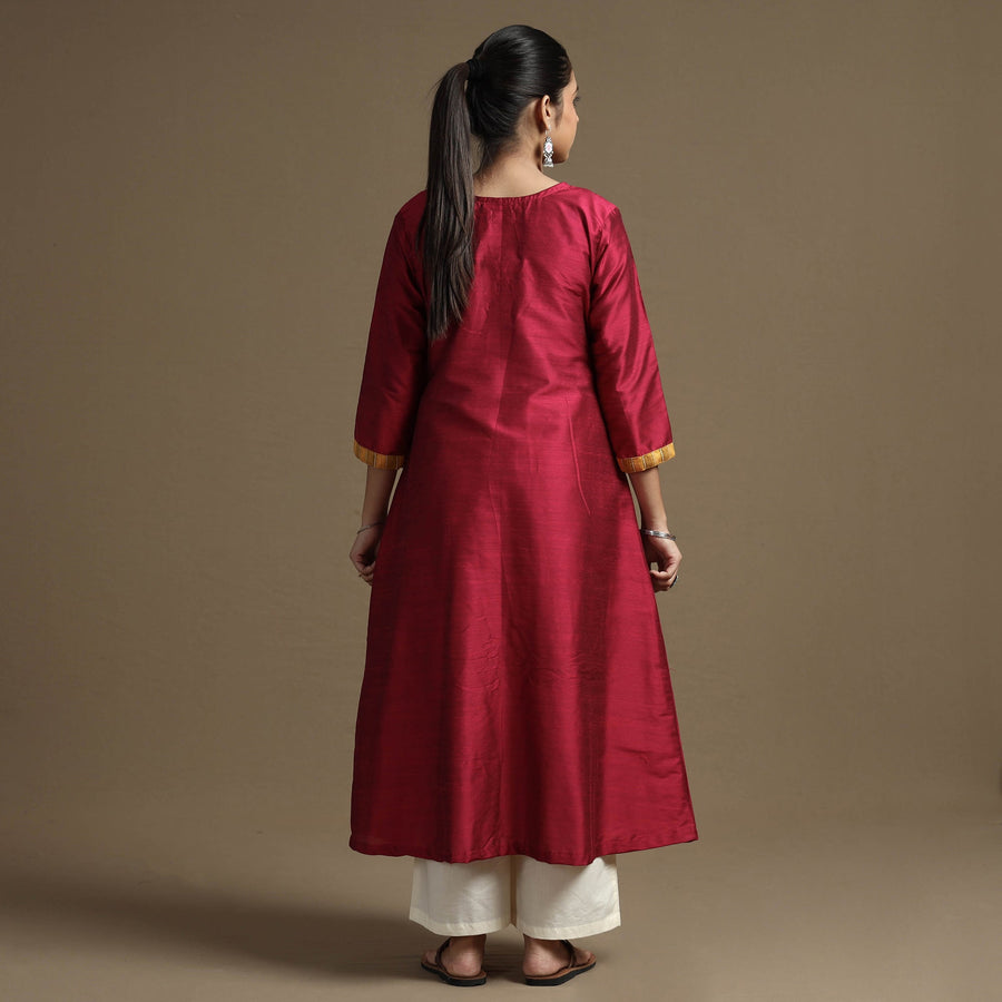 Look and feel beautiful in this uniquely designed red plain solid slub silk long Kurta. This Kurta is crafted from high-quality slub silk fabric, ensuring a luxurious and comfortable feel against your skin. It boasts an exquisite mashru silk patchwork design, adding a touch of elegance to your ensemble. The Kurta also features a convenient one-side pocket, perfect for carrying small essentials. It's an ideal choice for both casual and festive occasions.