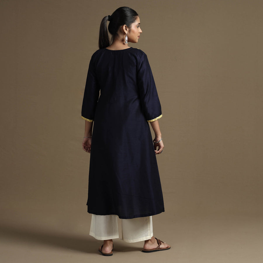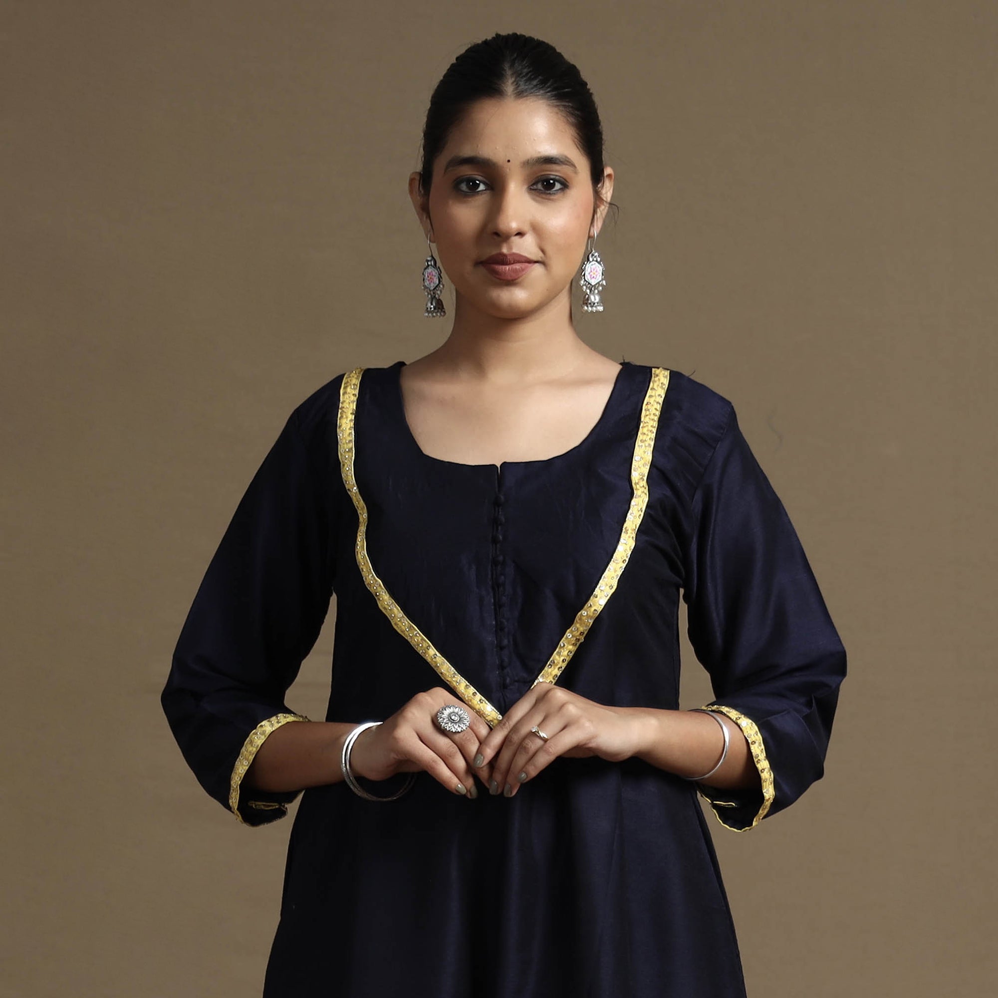 Look and feel beautiful in this uniquely designed plain solid slub silk long kurta. This kurta is crafted from high-quality slub silk fabric, ensuring a luxurious and comfortable feel against your skin. It boasts an exquisite beadwork lace design, adding a touch of elegance to your ensemble. The kurta also features a convenient one-side pocket, perfect for carrying small essentials. It's an ideal choice for both casual and festive occasions.