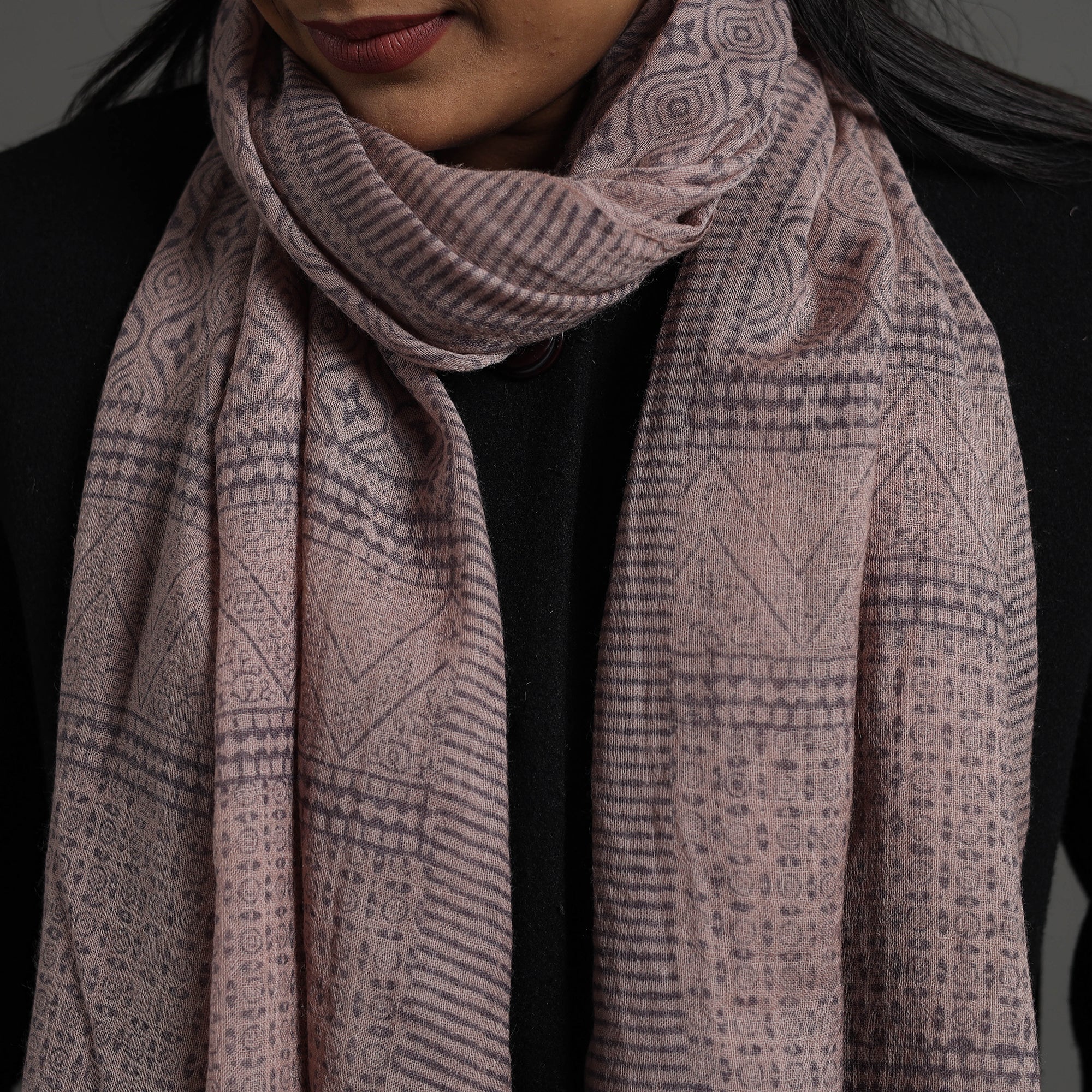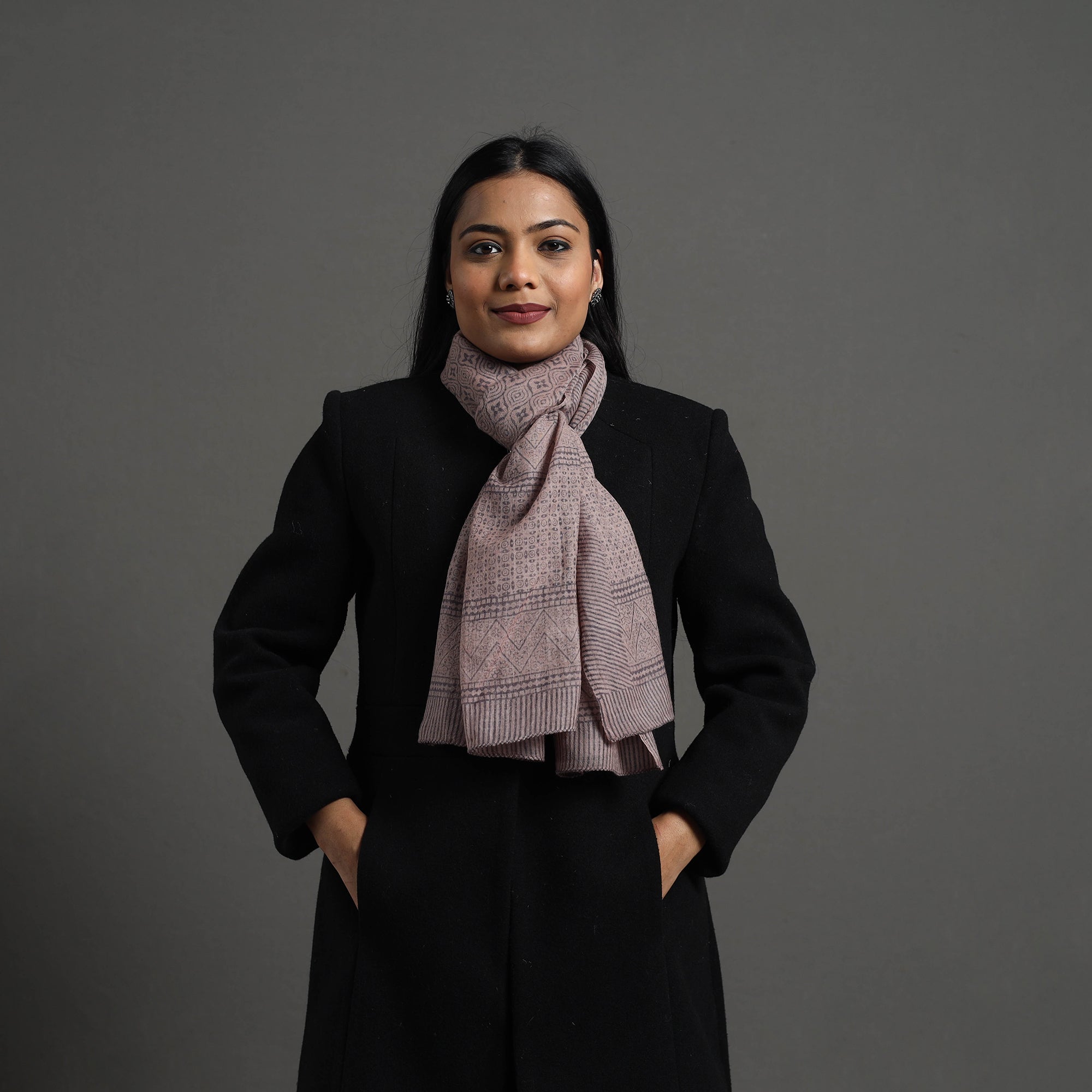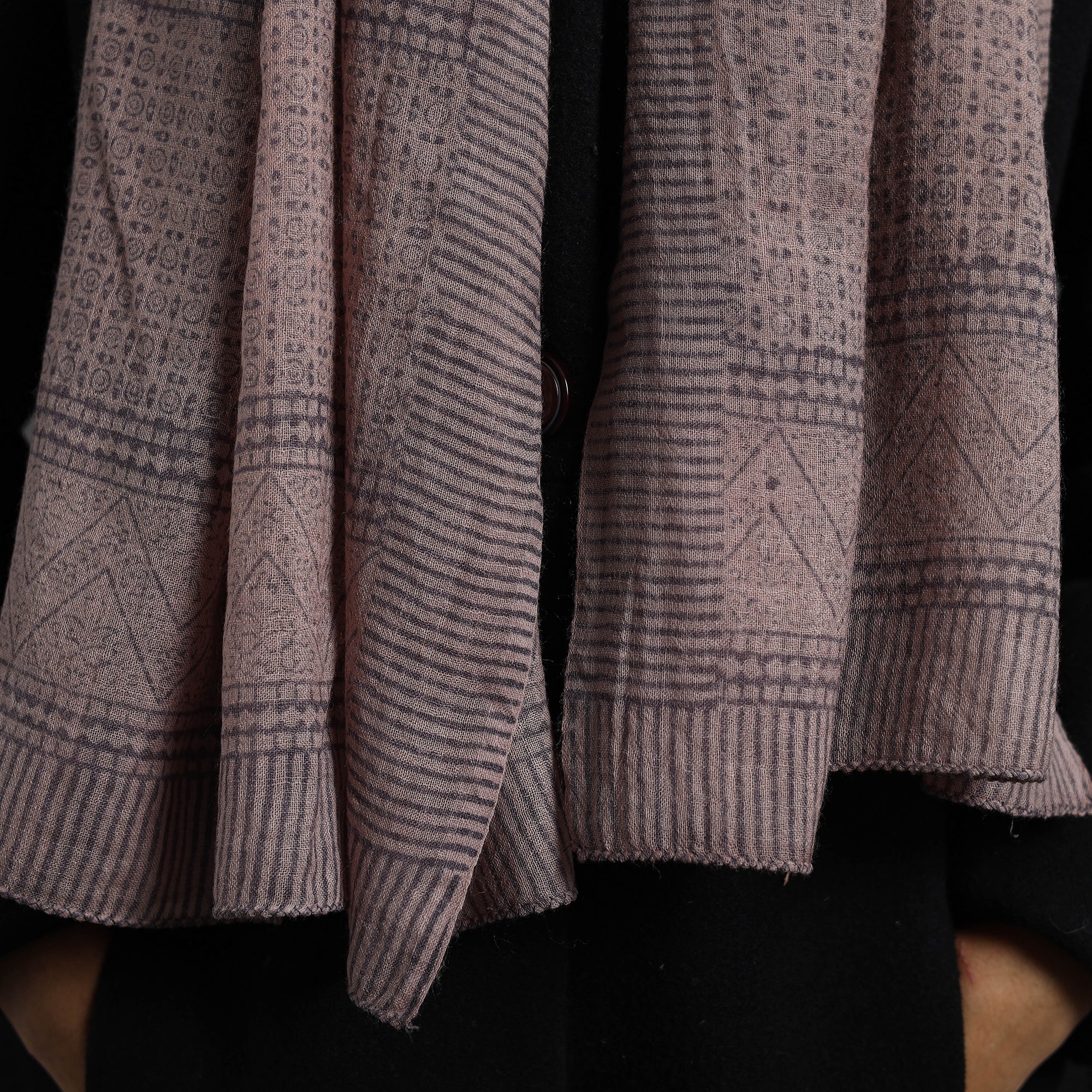 Elevate your style with this fine quality beige bagh hand block printed merino wool stole. This exquisite stole is made using natural dyes through the traditional process of hand block printing by Bilal Khatri in Bagh, the Dhar district of Madhya Pradesh. The merino wool construction offers exceptional warmth and softness, making it perfect for cold weather. This exquisite stole can elevate any outfit. It's versatile, suitable for both formal and casual occasions, adding a touch of traditional Indian artistry to your style.