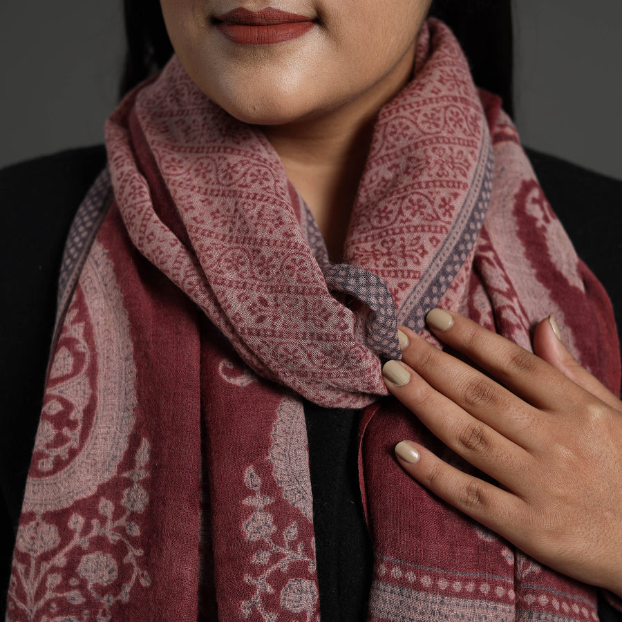 Elevate your style with this fine quality maroon bagh hand block printed merino wool stole. This exquisite stole is made using natural dyes through the traditional process of hand block printing by Bilal Khatri in Bagh, the Dhar district of Madhya Pradesh. The merino wool construction offers exceptional warmth and softness, making it perfect for cold weather. This exquisite stole can elevate any outfit. It's versatile, suitable for both formal and casual occasions, adding a touch of traditional Indian artistry to your style.