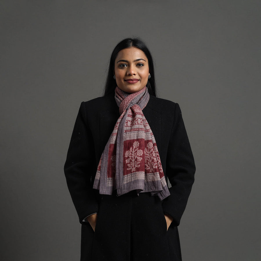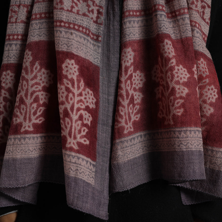 Elevate your style with this fine quality maroon bagh hand block printed merino woollen stole. This exquisite stole is made using natural dyes through the traditional process of hand block printing by Bilal Khatri in Bagh, the Dhar district of Madhya Pradesh. The merino wool construction offers exceptional warmth and softness, making it perfect for cold weather. This exquisite stole can elevate any outfit. It's versatile, suitable for both formal and casual occasions, adding a touch of traditional Indian artistry to your style.