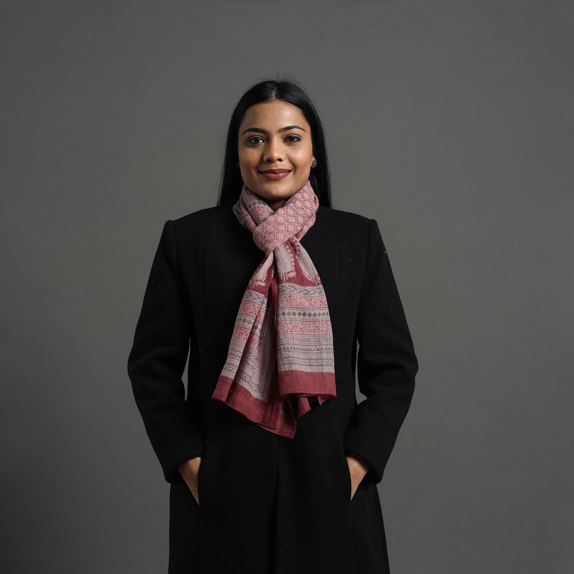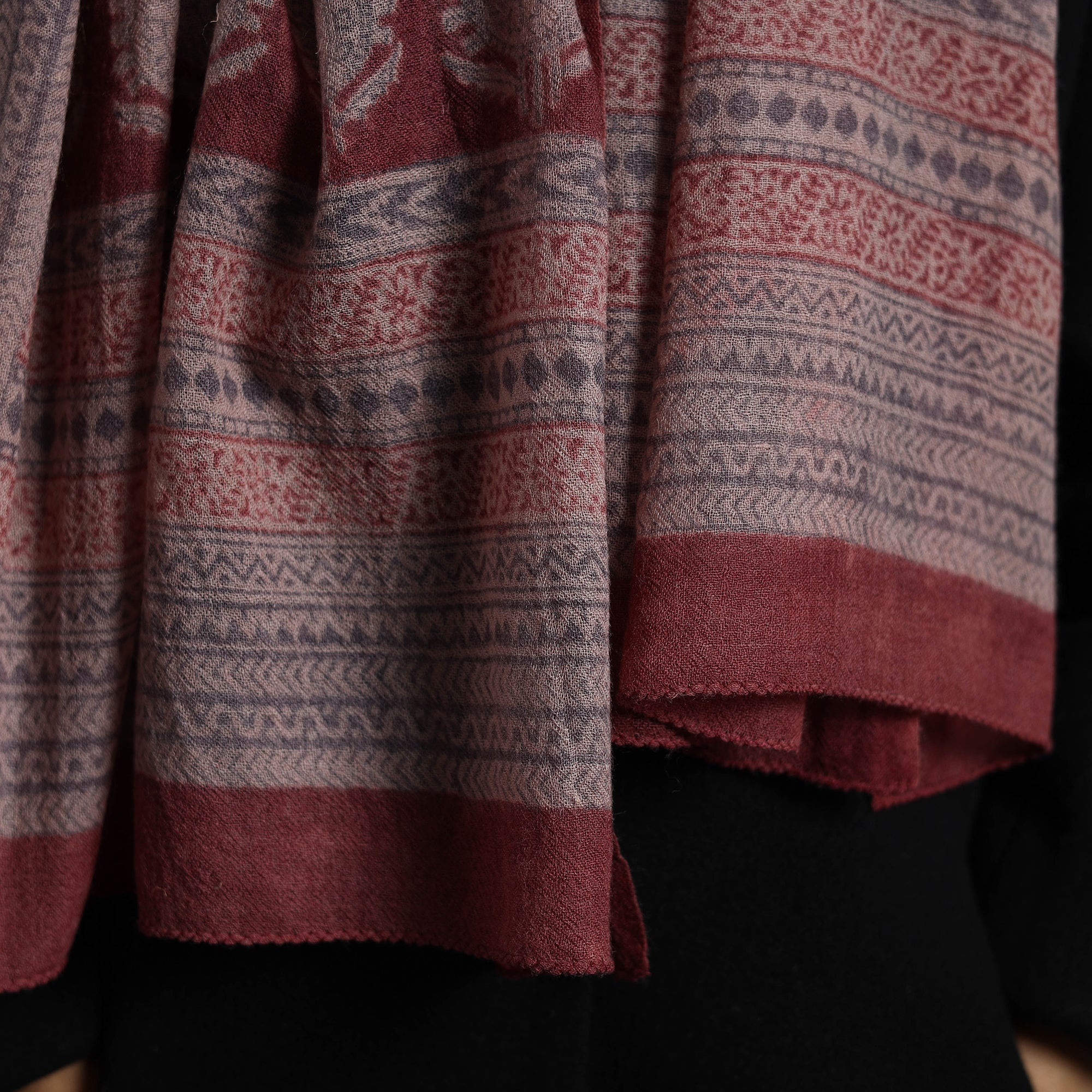 Elevate your style with this fine quality maroon bagh hand block printed merino wool stole. This exquisite stole is made using natural dyes through the traditional process of hand block printing by Bilal Khatri in Bagh, the Dhar district of Madhya Pradesh. The merino wool construction offers exceptional warmth and softness, making it perfect for cold weather. This exquisite stole can elevate any outfit. It's versatile, suitable for both formal and casual occasions, adding a touch of traditional Indian artistry to your style.