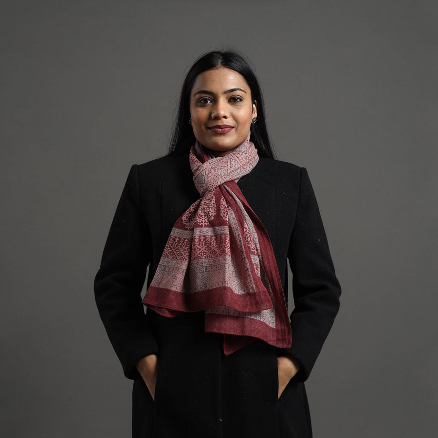 Elevate your style with this fine quality maroon bagh hand block printed merino wool stole. This exquisite stole is made using natural dyes through the traditional process of hand block printing by Bilal Khatri in Bagh, the Dhar district of Madhya Pradesh. The merino wool construction offers exceptional warmth and softness, making it perfect for cold weather. This exquisite stole can elevate any outfit. It's versatile, suitable for both formal and casual occasions, adding a touch of traditional Indian artistry to your style.