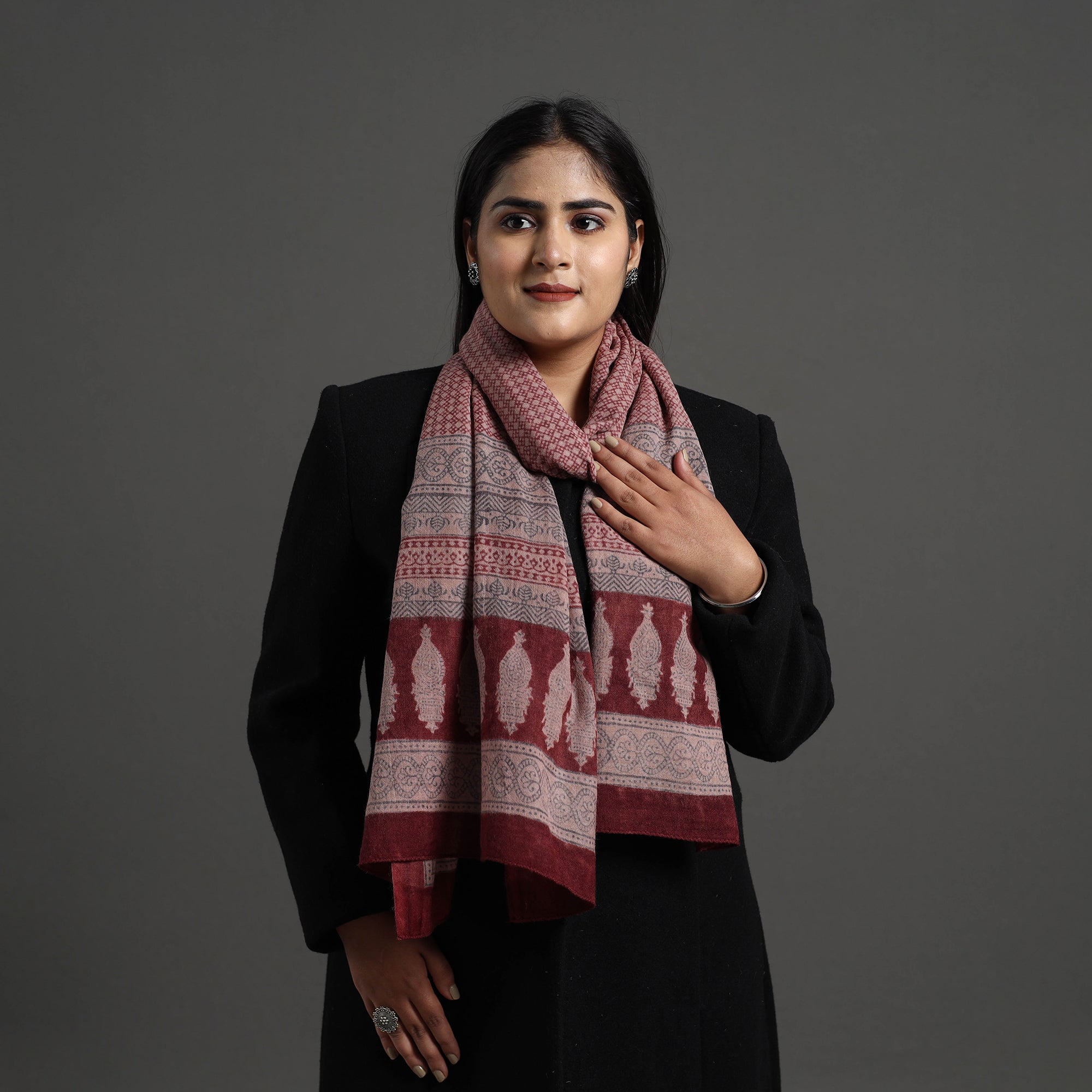 Elevate your style with this fine quality maroon bagh hand block printed merino woollen stole. This exquisite stole is made using natural dyes through the traditional process of hand block printing by Bilal Khatri in Bagh, the Dhar district of Madhya Pradesh. The merino wool construction offers exceptional warmth and softness, making it perfect for cold weather. This exquisite stole can elevate any outfit. It's versatile, suitable for both formal and casual occasions, adding a touch of traditional Indian artistry to your style.