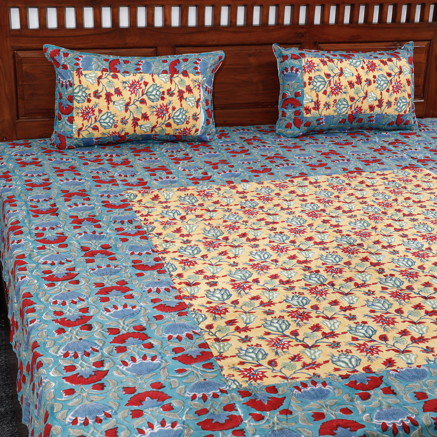This exquisite Sanganeri Block Printed Patchwork Cotton Bed sheet accompanied by matching pillow covers. This bed cover features the traditional art of Sanganeri block printing, showcasing intricate patterns and vibrant colors. The patchwork design adds an extra layer of artistry, making it a unique and elegant addition to your home. Crafted from high-quality cotton, it offers comfort and style. Add a touch of traditional Indian craftsmanship to your bedroom with this beautiful bed cover and pillow cover set.
