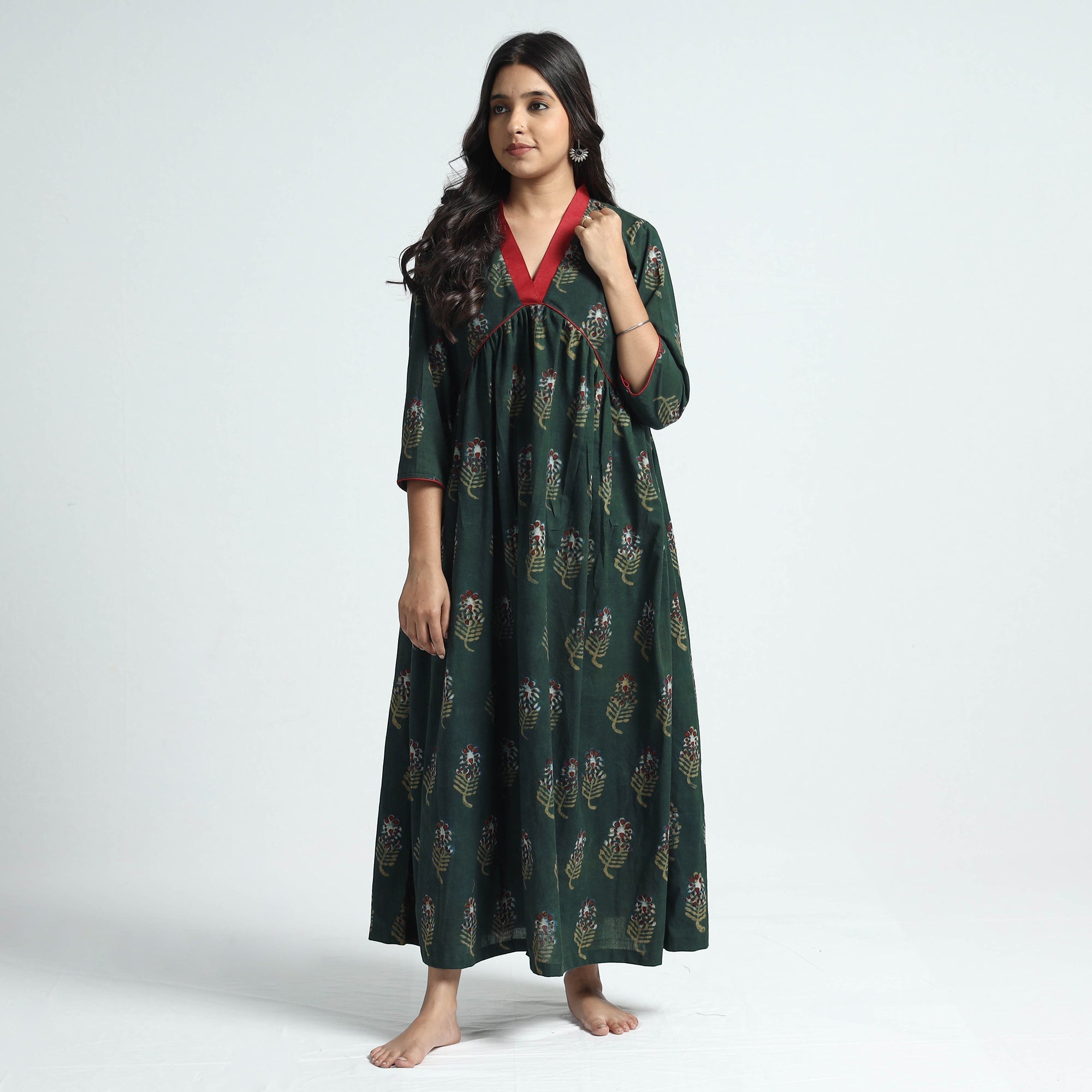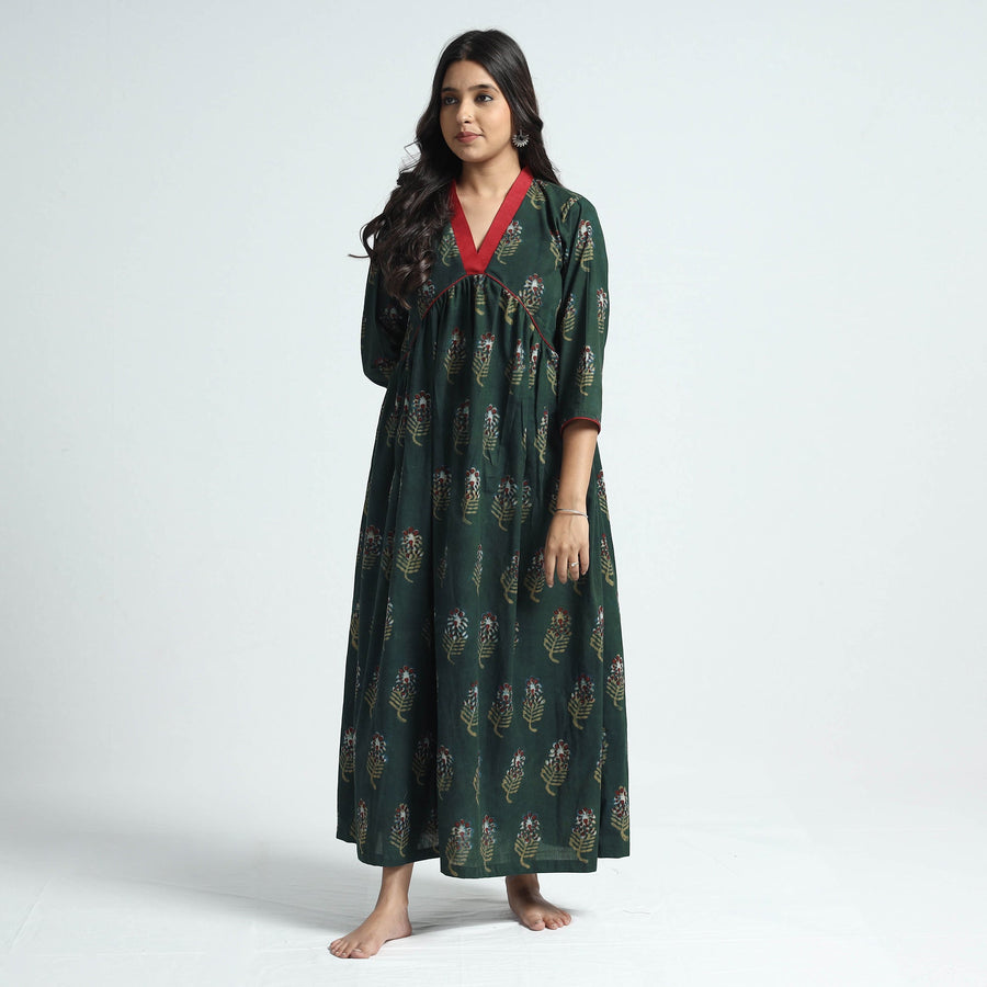 Look and feel beautiful in this uniquely designed nandana hand block printed cotton dress. This exquisite cotton dress makes you comfortable with ease all day long. This dress is perfect for your daily outing and for a special occasion.