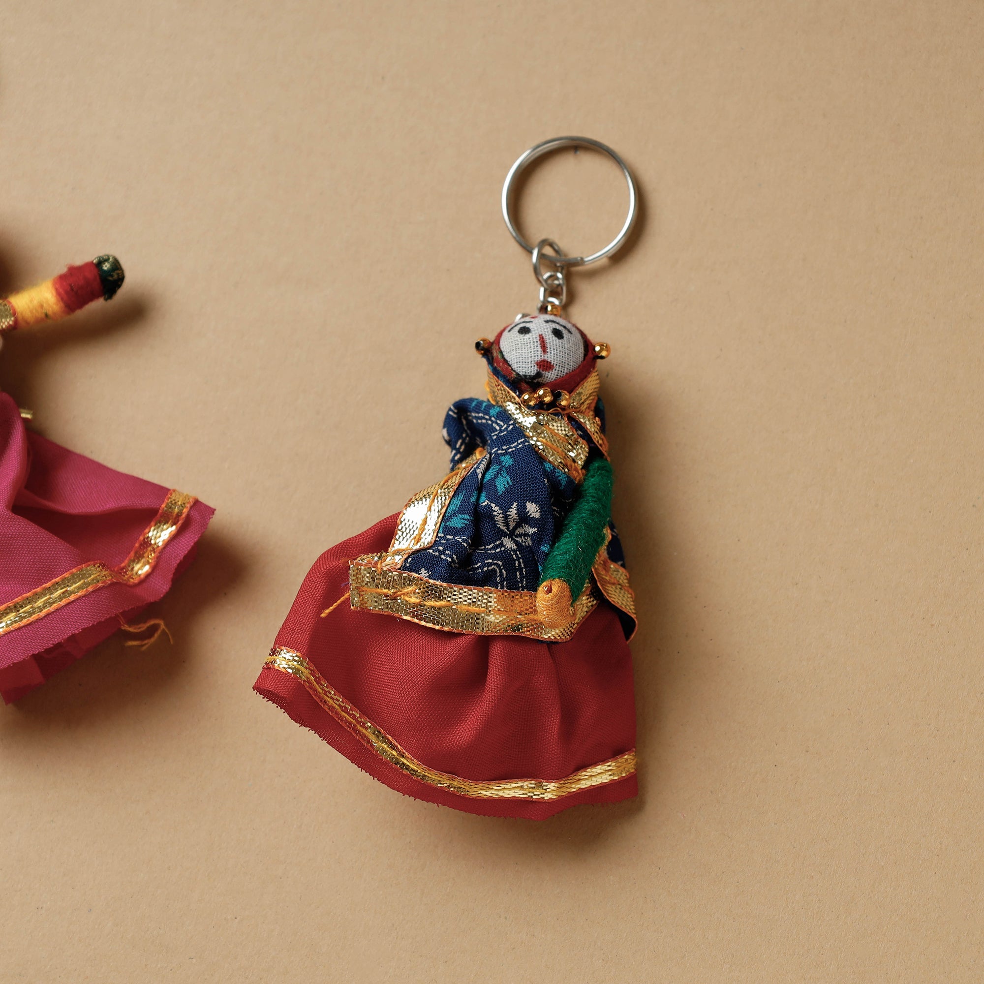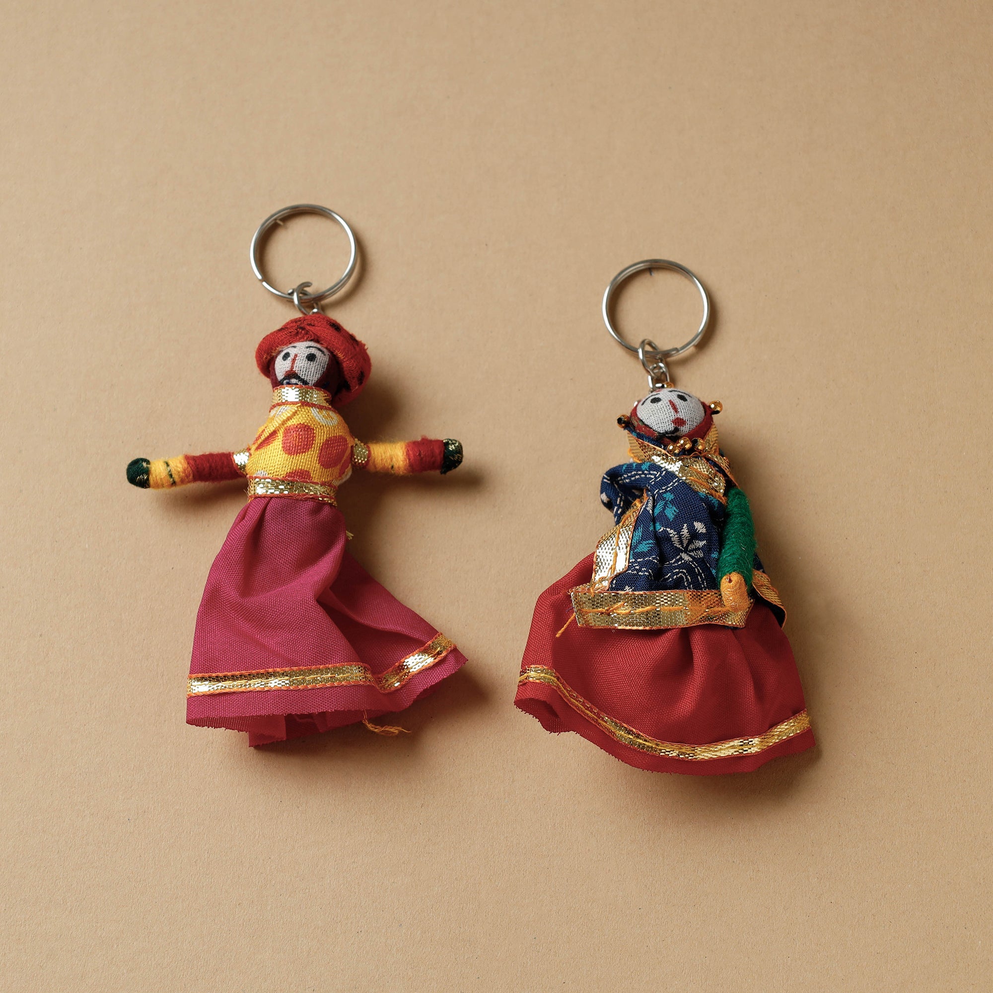Elevate your keys with our beautifully handcrafted Rajasthani puppet couple keychain. Crafted from cotton fabric and adorned with intricate gota patti work, these keychains add a touch of Rajasthan's cultural richness to your daily essentials. Not only do they keep your keys organized, but they also serve as charming, miniature pieces of art that make for a unique and eye-catching accessory.