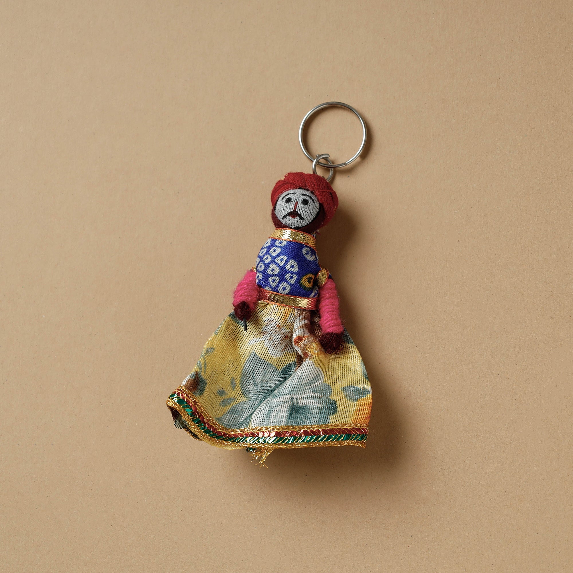 Elevate your keys with our beautifully handcrafted Rajasthani puppet couple keychain. Crafted from cotton fabric and adorned with intricate gota patti work, these keychains add a touch of Rajasthan's cultural richness to your daily essentials. Not only do they keep your keys organized, but they also serve as charming, miniature pieces of art that make for a unique and eye-catching accessory.