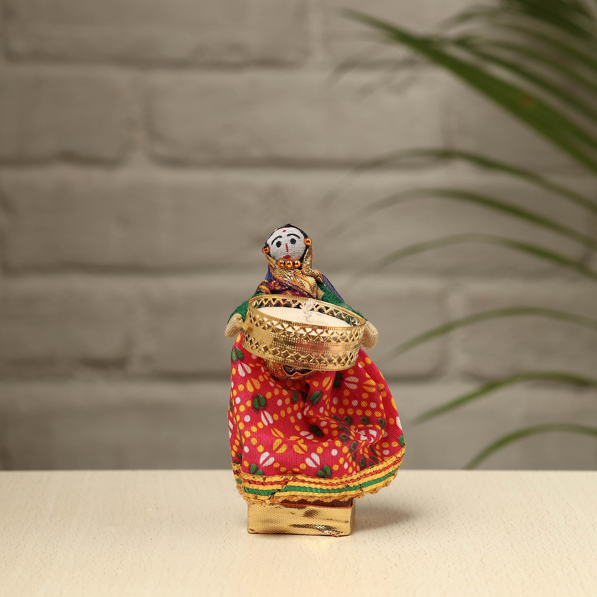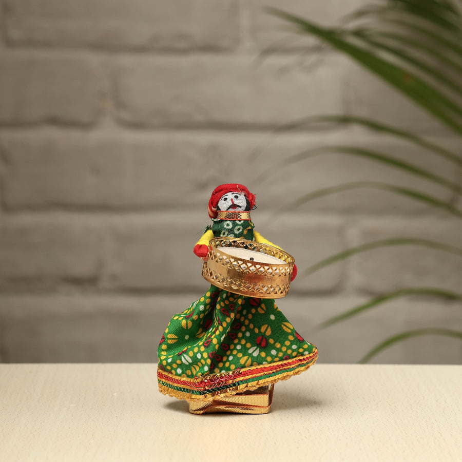Elevate your decor with our exquisite Rajasthani puppet couple tealight candle holders. Meticulously handcrafted from wood, adorned with vibrant cotton fabric, and embellished with intricate gota patti work, these holders add a touch of Rajasthan's rich heritage to your home. Perfect for creating a warm, inviting ambiance, they're a charming addition to any space and make for a unique gifting option.