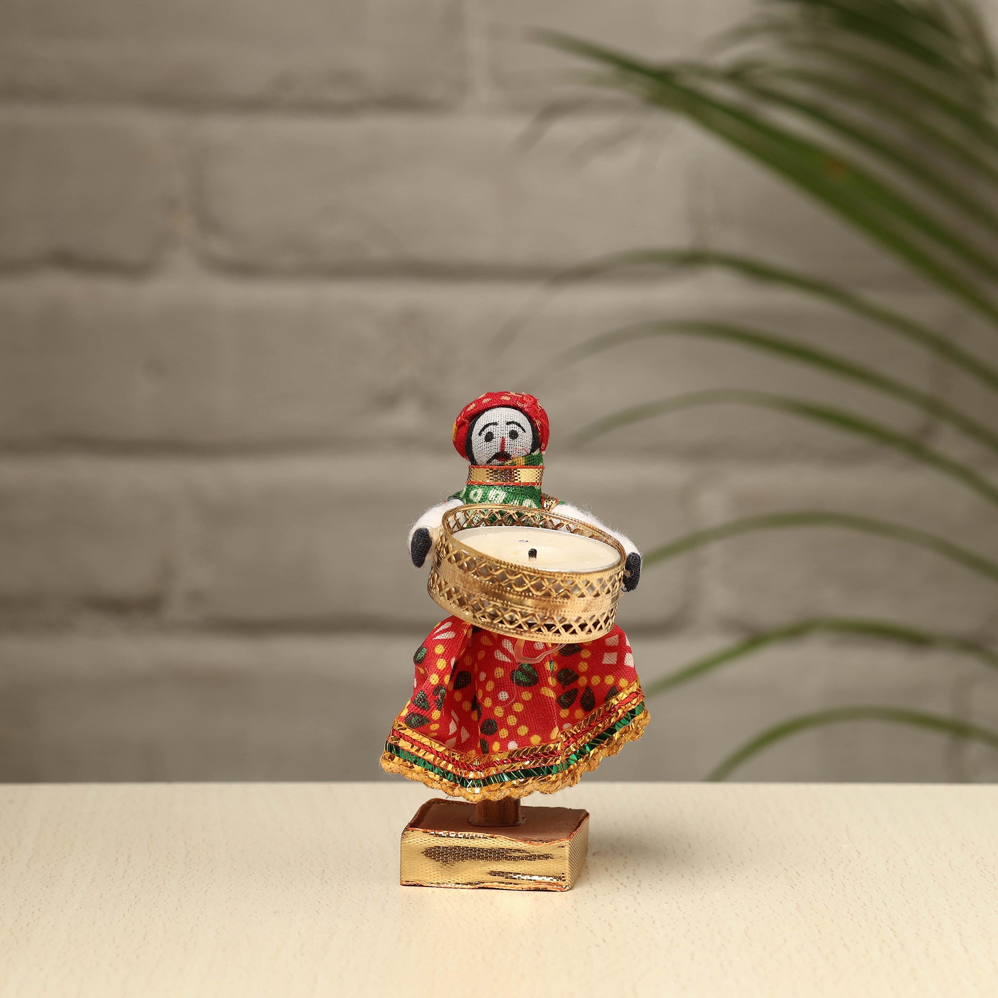 Elevate your decor with our exquisite Rajasthani puppet couple tealight candle holders. Meticulously handcrafted from wood, adorned with vibrant cotton fabric, and embellished with intricate gota patti work, these holders add a touch of Rajasthan's rich heritage to your home. Perfect for creating a warm, inviting ambiance, they're a charming addition to any space and make for a unique gifting option.