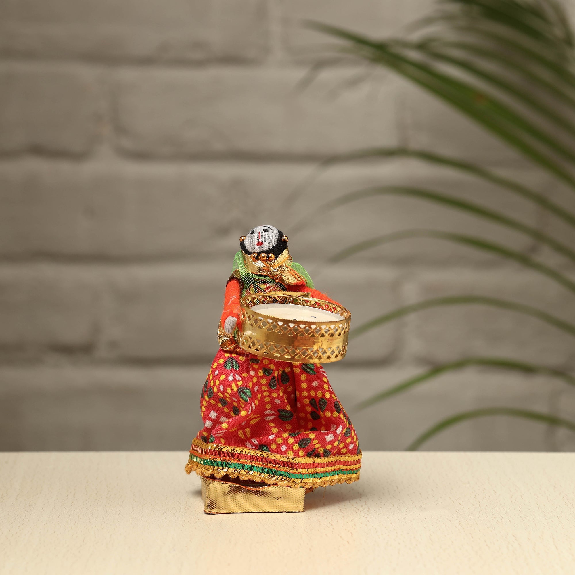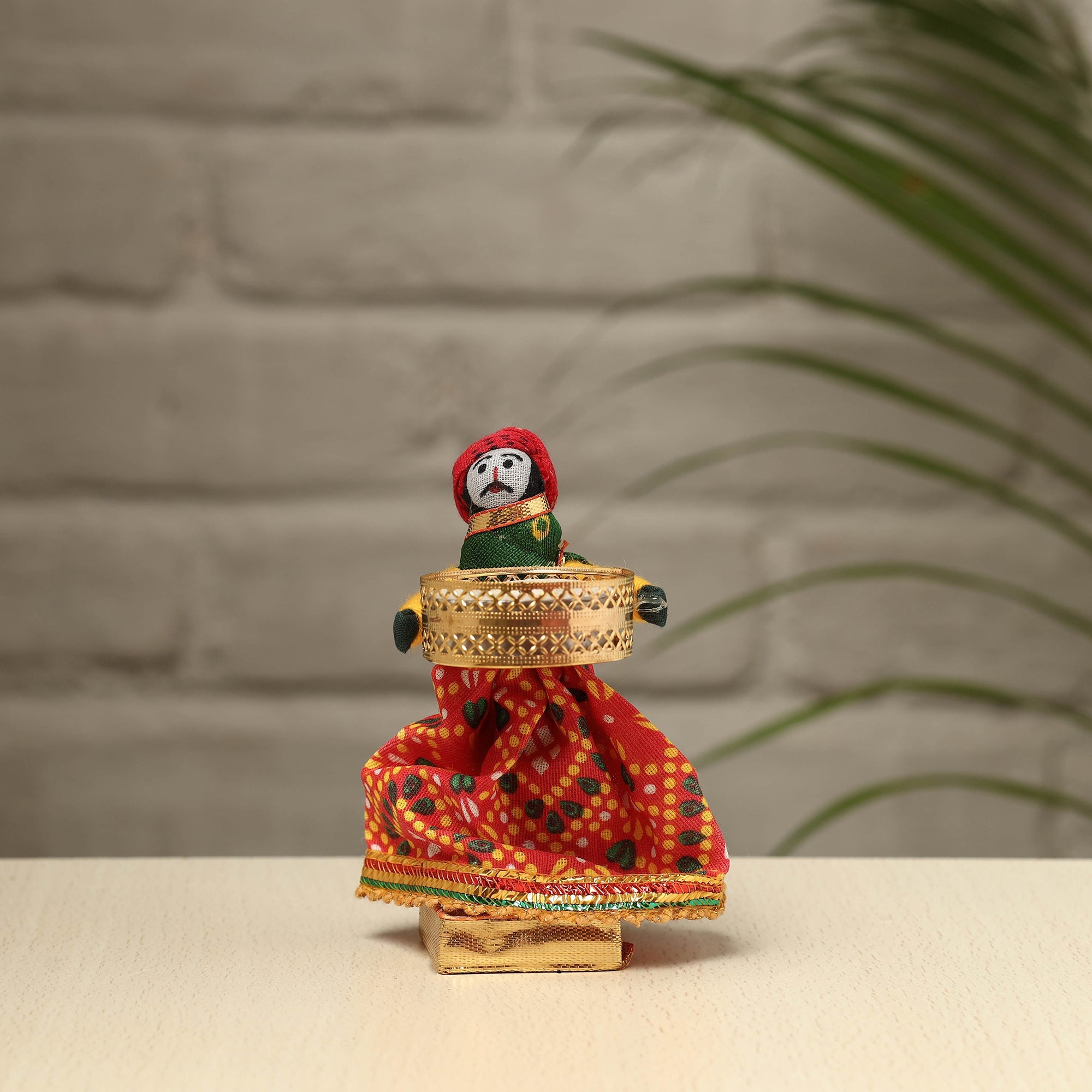 Material Elevate your decor with our exquisite Rajasthani puppet couple tealight candle holders. Meticulously handcrafted from wood, adorned with vibrant cotton fabric, and embellished with intricate gota patti work, these holders add a touch of Rajasthan's rich heritage to your home. Perfect for creating a warm, inviting ambiance, they're a charming addition to any space and make for a unique gifting option.