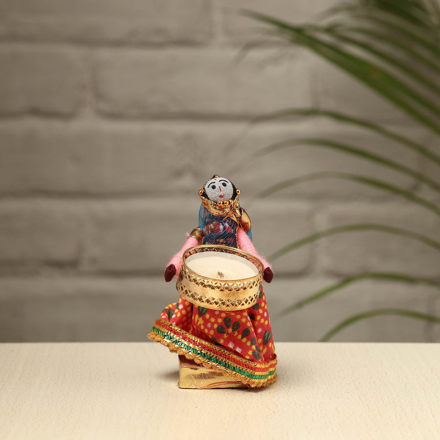 Material Elevate your decor with our exquisite Rajasthani puppet couple tealight candle holders. Meticulously handcrafted from wood, adorned with vibrant cotton fabric, and embellished with intricate gota patti work, these holders add a touch of Rajasthan's rich heritage to your home. Perfect for creating a warm, inviting ambiance, they're a charming addition to any space and make for a unique gifting option.