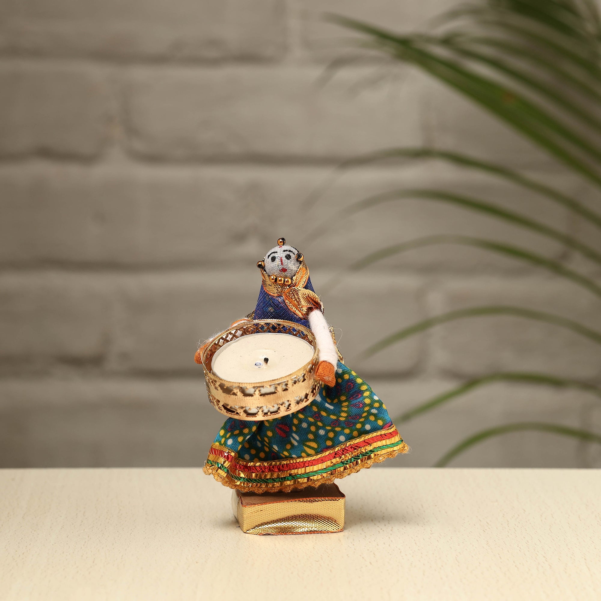 Material Elevate your decor with our exquisite Rajasthani puppet couple tealight candle holders. Meticulously handcrafted from wood, adorned with vibrant cotton fabric, and embellished with intricate gota patti work, these holders add a touch of Rajasthan's rich heritage to your home. Perfect for creating a warm, inviting ambiance, they're a charming addition to any space and make for a unique gifting option.