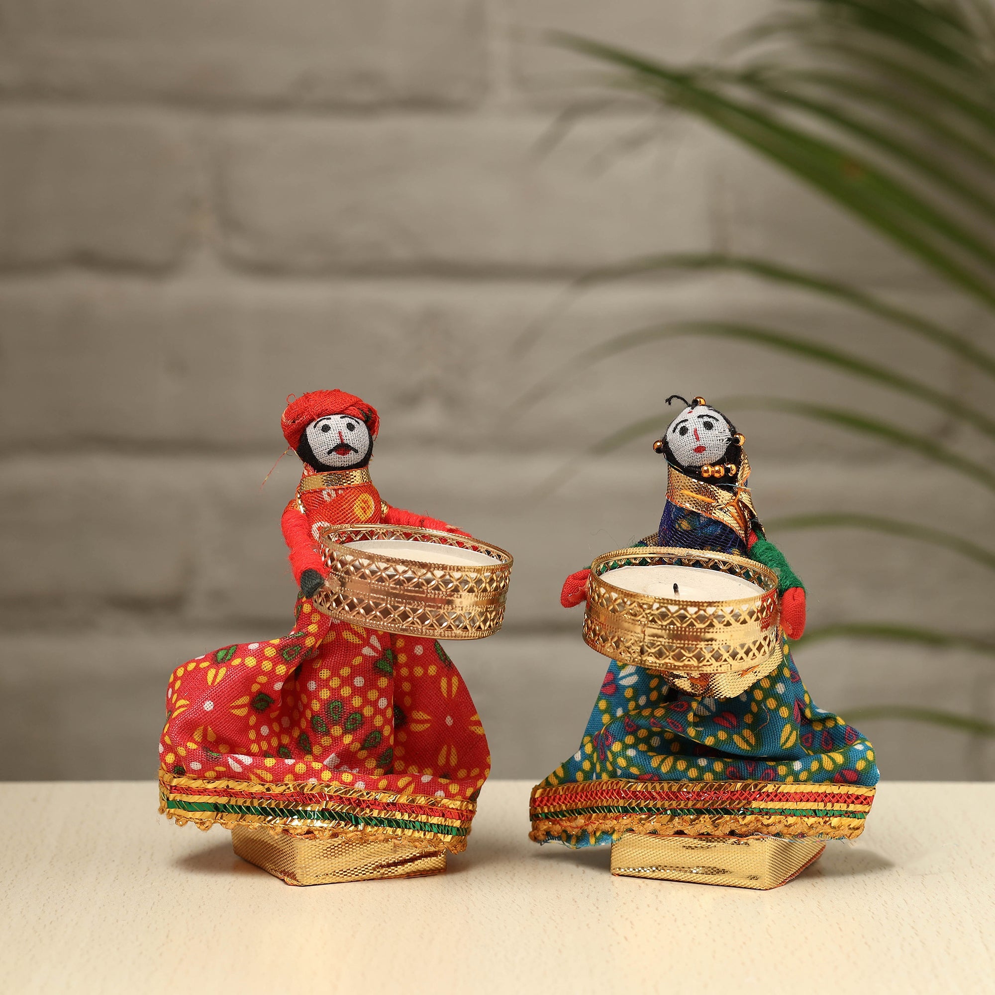 Elevate your decor with our exquisite Rajasthani puppet couple tealight candle holders. Meticulously handcrafted from wood, adorned with vibrant cotton fabric, and embellished with intricate gota patti work, these holders add a touch of Rajasthan's rich heritage to your home. Perfect for creating a warm, inviting ambiance, they're a charming addition to any space and make for a unique gifting option.