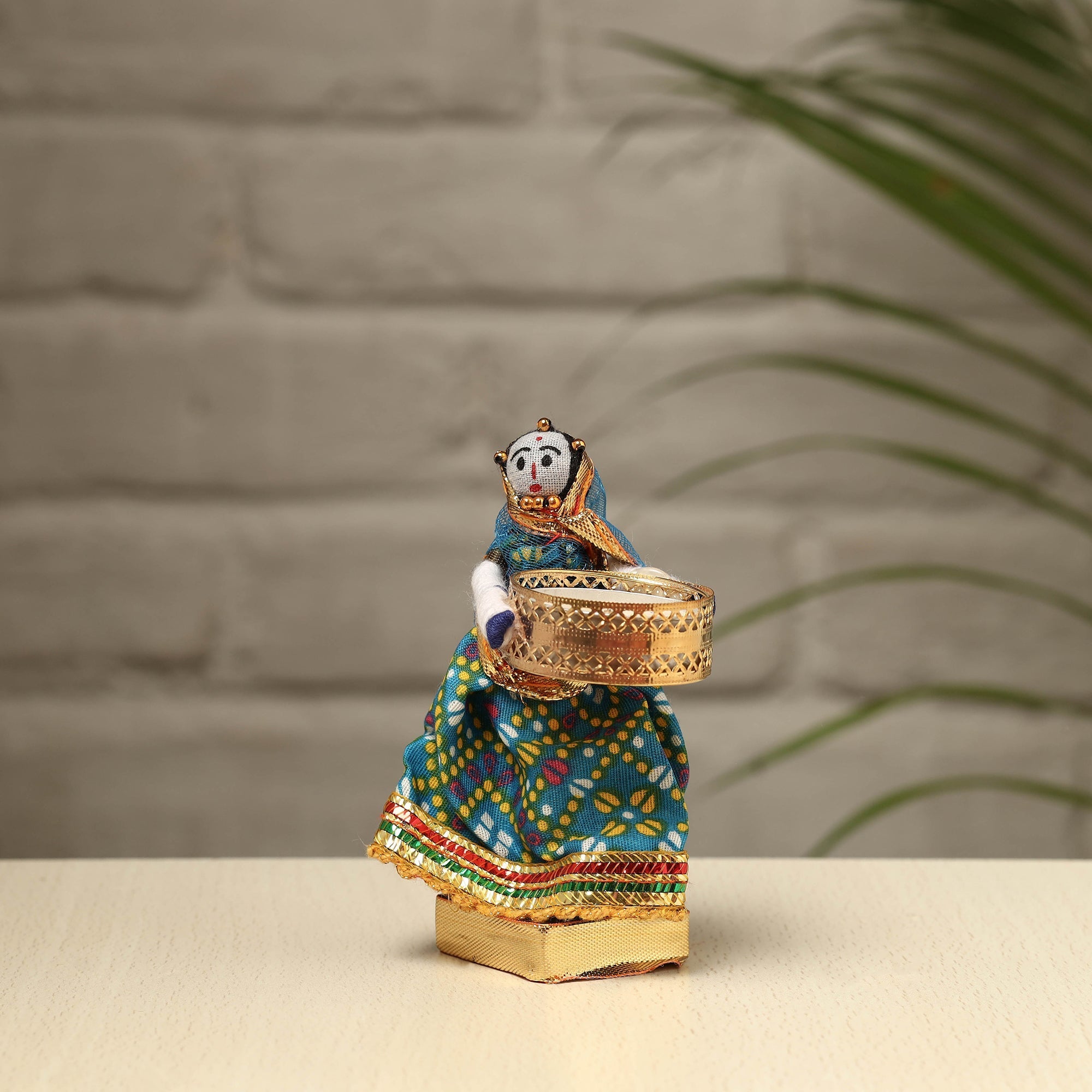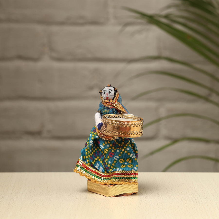 Material Elevate your decor with our exquisite Rajasthani puppet couple tealight candle holders. Meticulously handcrafted from wood, adorned with vibrant cotton fabric, and embellished with intricate gota patti work, these holders add a touch of Rajasthan's rich heritage to your home. Perfect for creating a warm, inviting ambiance, they're a charming addition to any space and make for a unique gifting option.