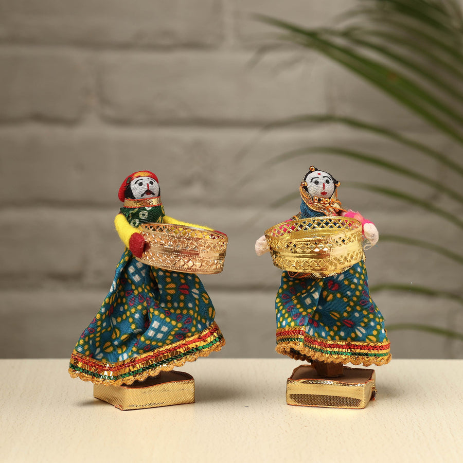 Elevate your decor with our exquisite Rajasthani puppet couple tealight candle holders. Meticulously handcrafted from wood, adorned with vibrant cotton fabric, and embellished with intricate gota patti work, these holders add a touch of Rajasthan's rich heritage to your home. Perfect for creating a warm, inviting ambiance, they're a charming addition to any space and make for a unique gifting option.