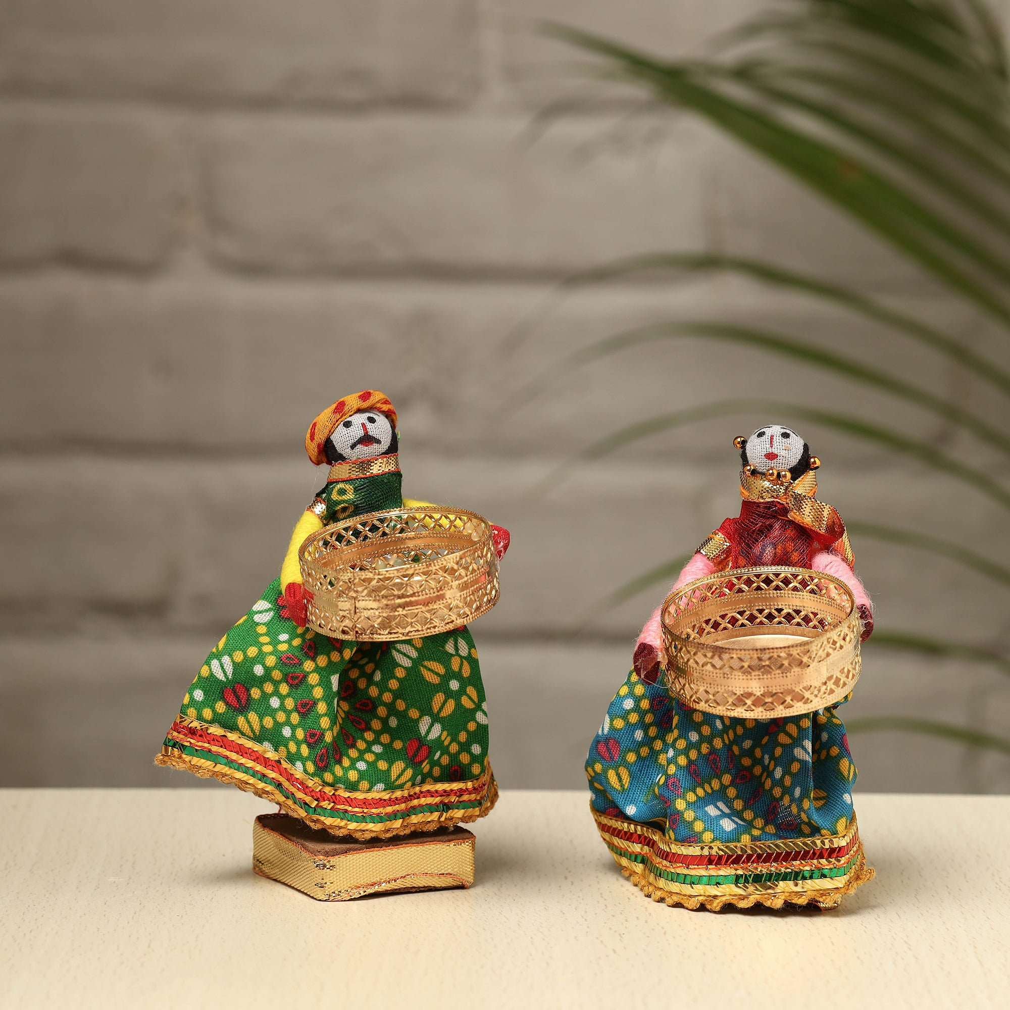 Material Elevate your decor with our exquisite Rajasthani puppet couple tealight candle holders. Meticulously handcrafted from wood, adorned with vibrant cotton fabric, and embellished with intricate gota patti work, these holders add a touch of Rajasthan's rich heritage to your home. Perfect for creating a warm, inviting ambiance, they're a charming addition to any space and make for a unique gifting option.