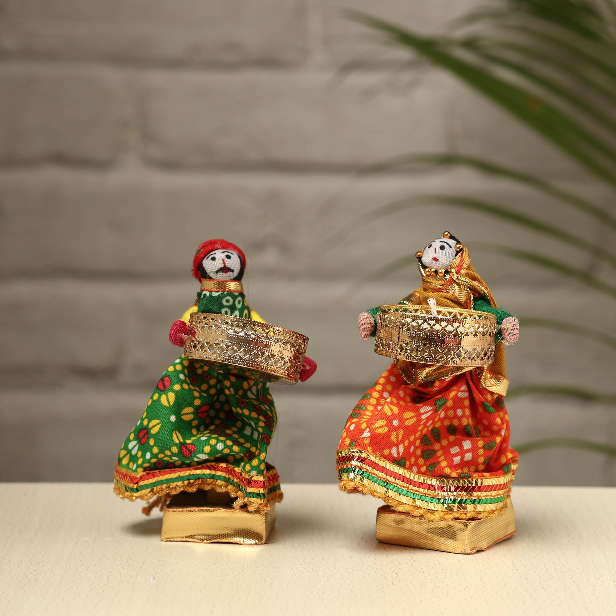 Elevate your decor with our exquisite Rajasthani puppet couple tealight candle holders. Meticulously handcrafted from wood, adorned with vibrant cotton fabric, and embellished with intricate gota patti work, these holders add a touch of Rajasthan's rich heritage to your home. Perfect for creating a warm, inviting ambiance, they're a charming addition to any space and make for a unique gifting option.