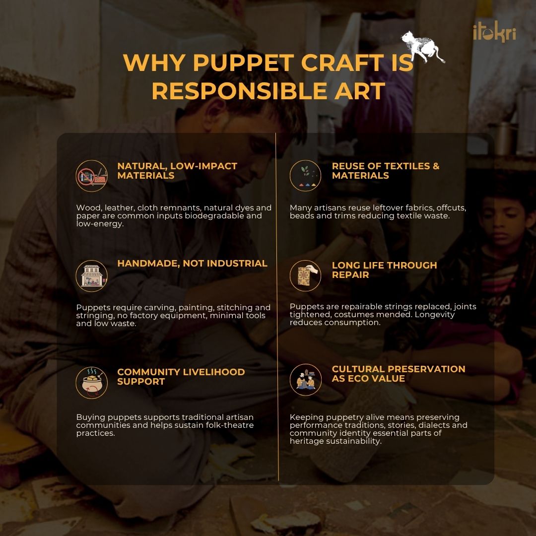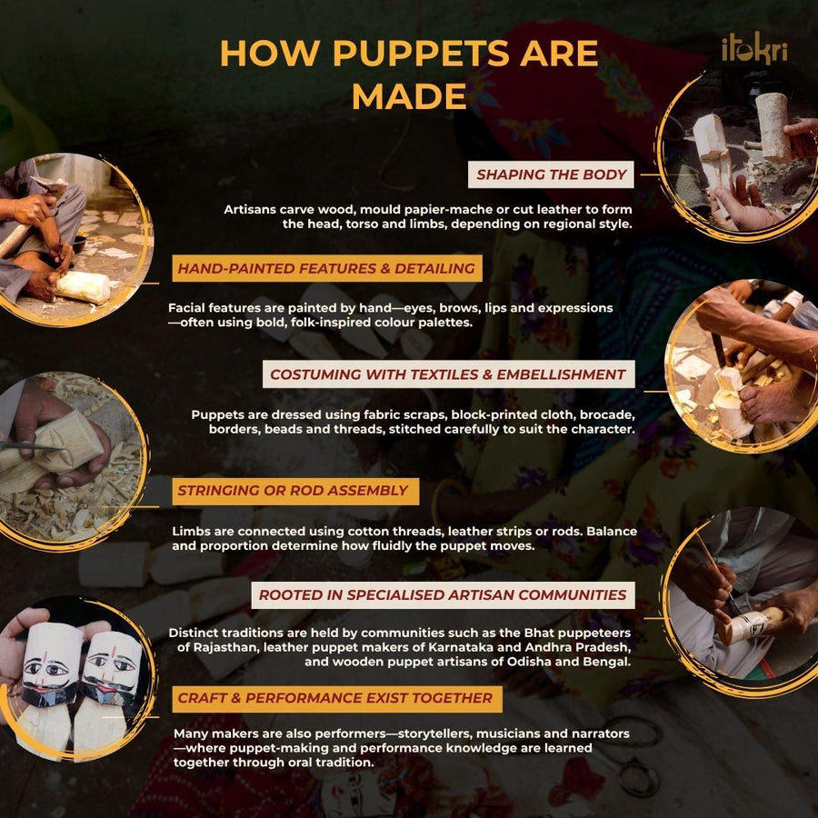 The Kathputli tradition of Rajasthan is a centuries-old puppetry art form, believed to be over 1,000 years old. Derived from the words Kath (wood) and Putli (doll), these handcrafted string puppets are made from wood, adorned with vibrant fabrics, and intricately painted faces.