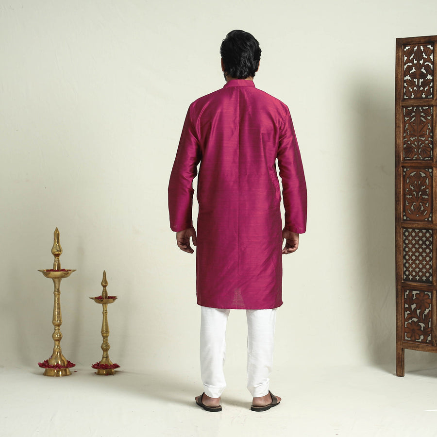 Fine quality plain dyed slub silk men's long kurta with two side pockets makes you comfortable with ease all day long. It's made from plain slub silk fabric and features full sleeves and a chinese collar with a button placket. This casual kurta is perfect for your daily outing and for a special occasion.