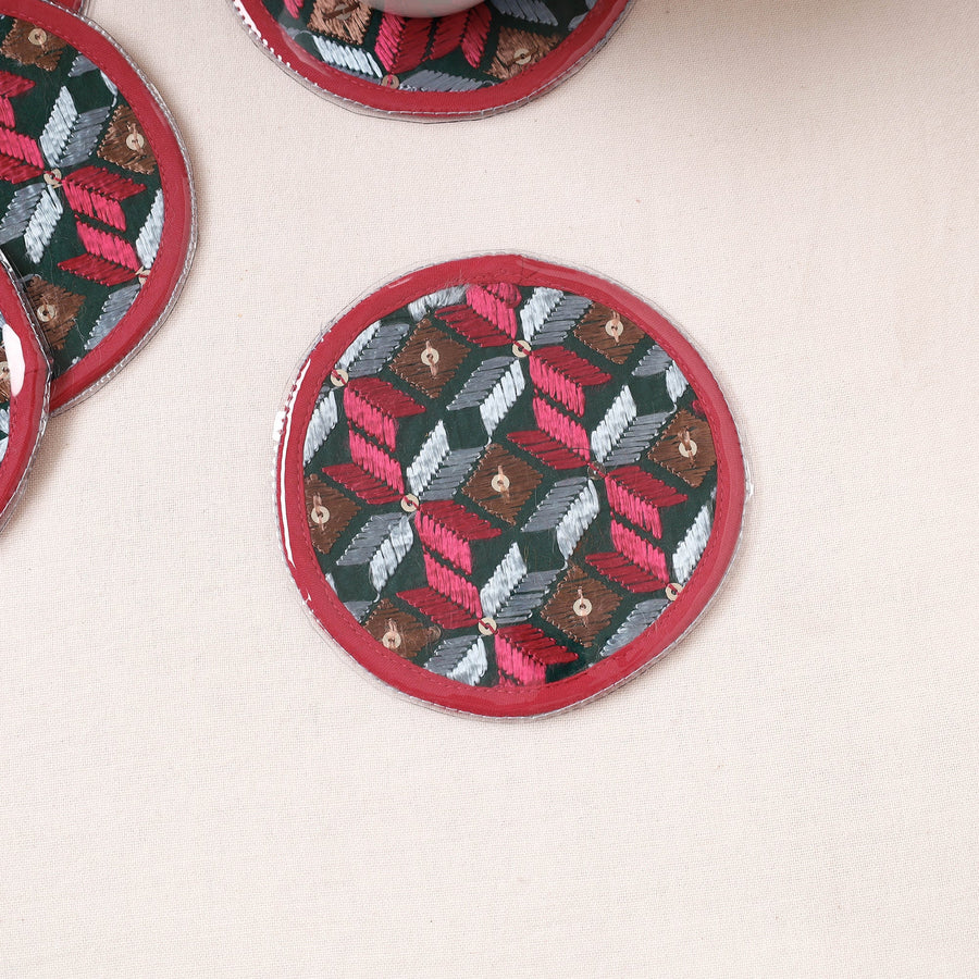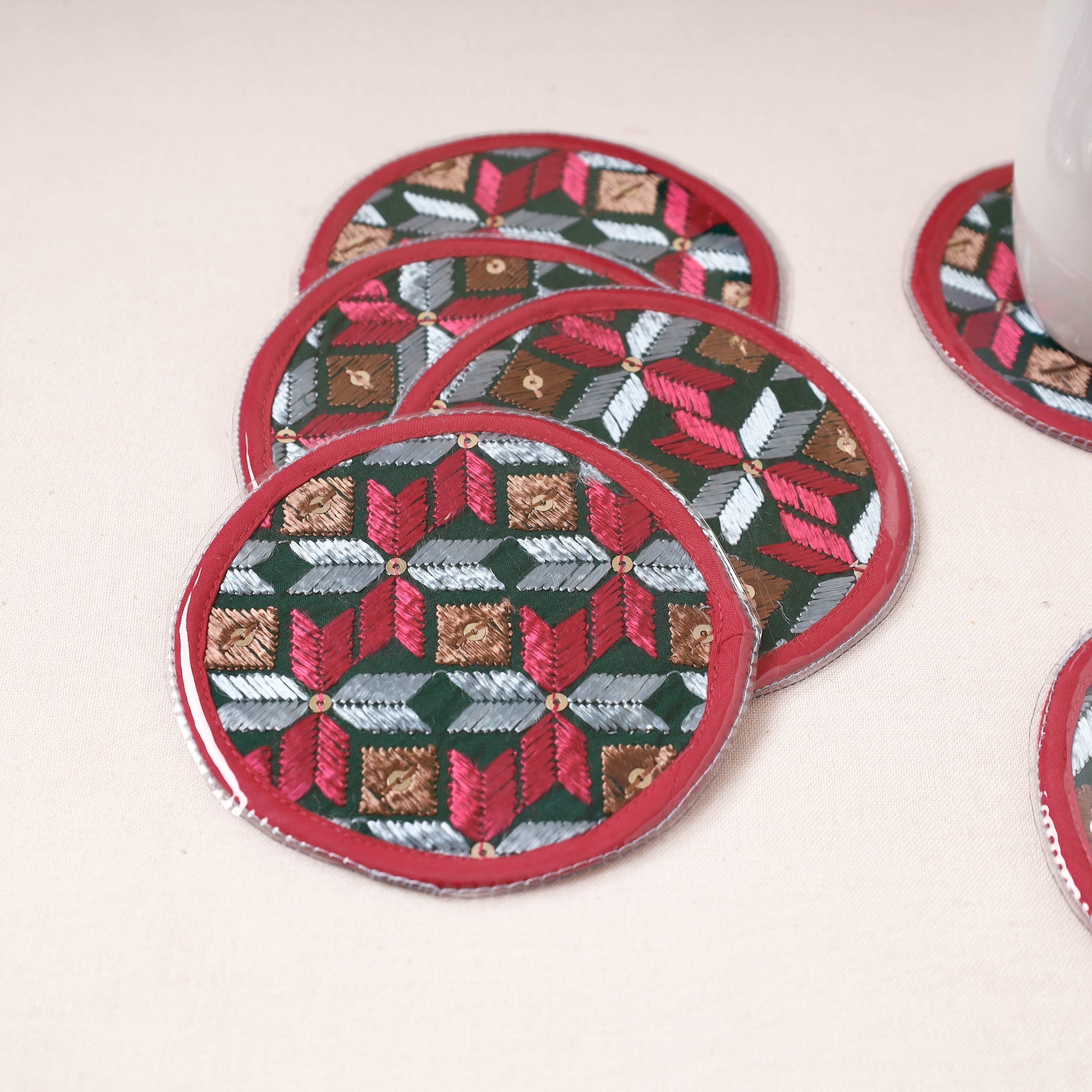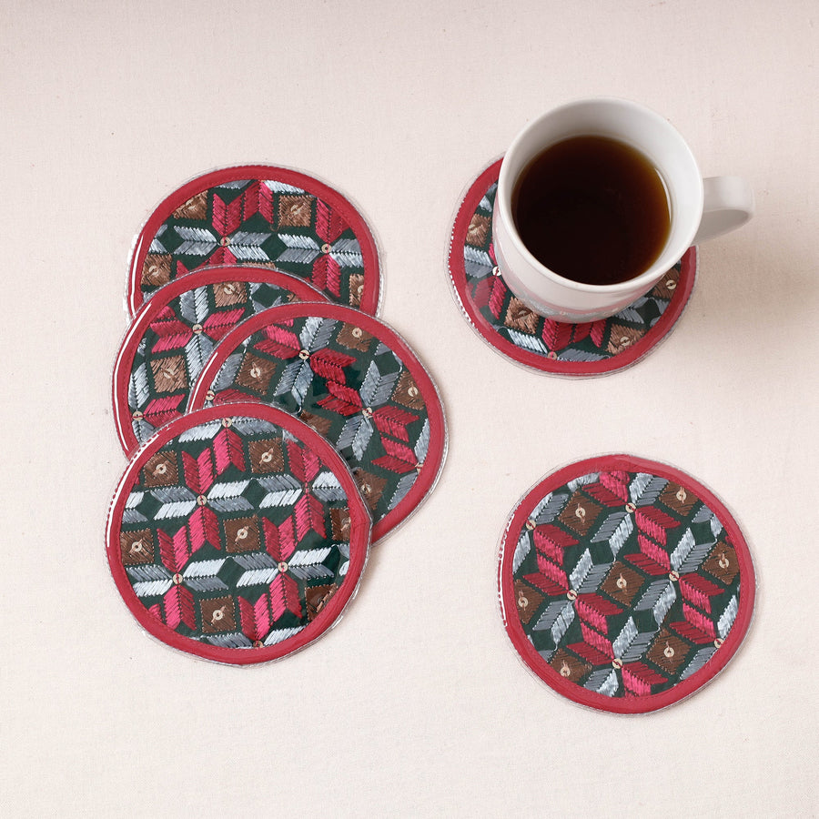 Elevate your table decor with these exquisitely handcrafted Phulkari hand embroidery laminated coasters. The word phul means flower and kari means craft. Phulkari is the art of making beautiful intricate designs and motifs on fabrics with different coloured threads. These coasters not only protect your surfaces but also showcase the artistry of Punjab's rich embroidery tradition.