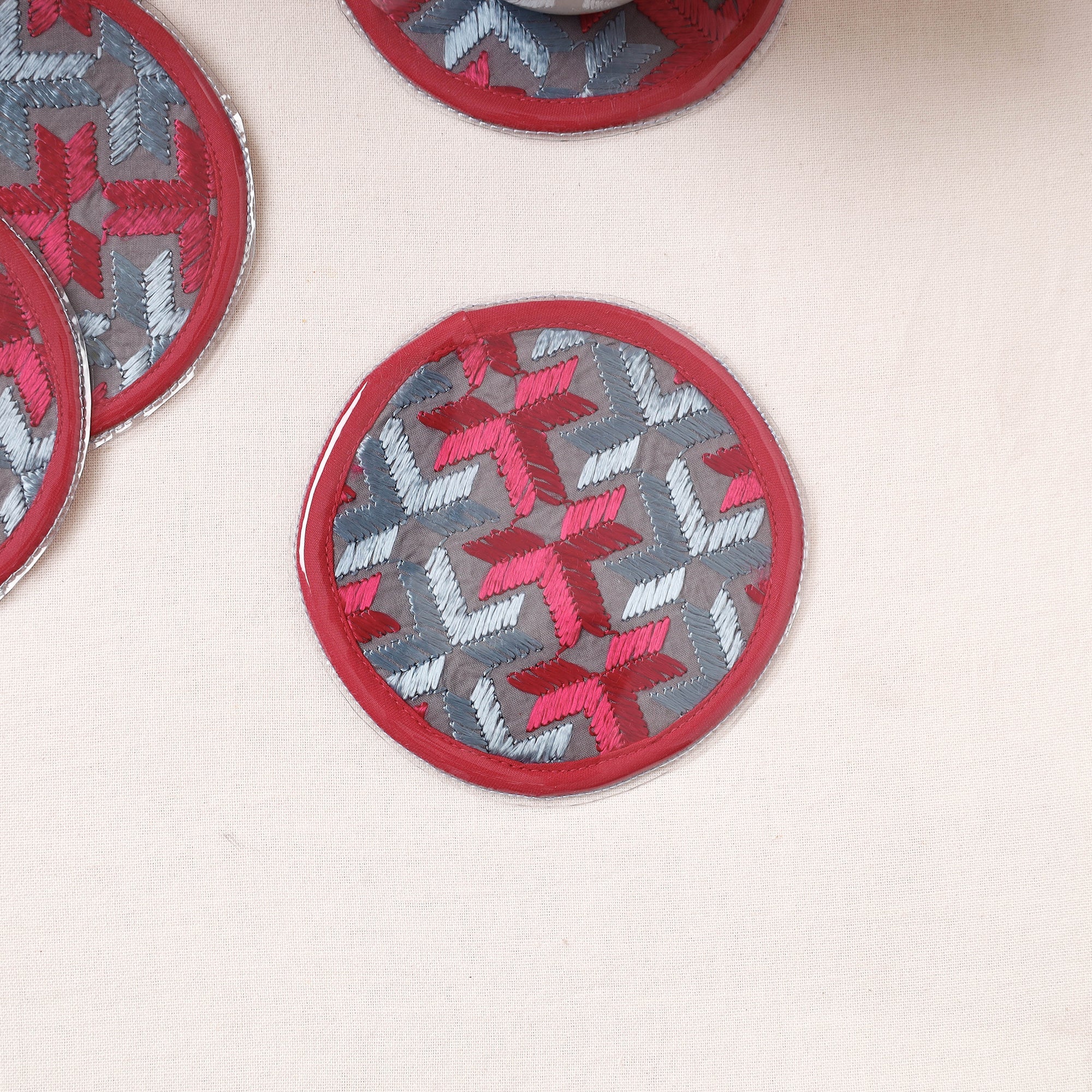 Elevate your table decor with these exquisitely handcrafted Phulkari hand embroidery laminated coasters. The word phul means flower and kari means craft. Phulkari is the art of making beautiful intricate designs and motifs on fabrics with different coloured threads. These coasters not only protect your surfaces but also showcase the artistry of Punjab's rich embroidery tradition.