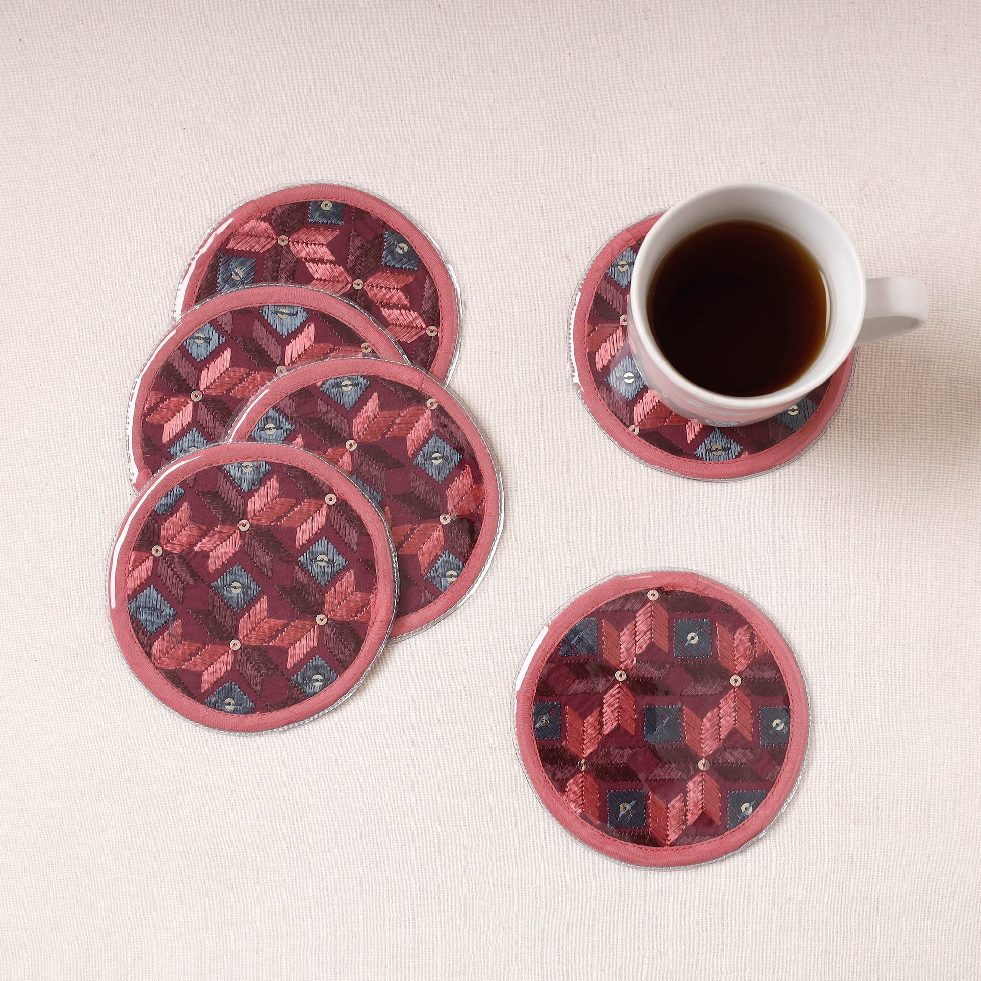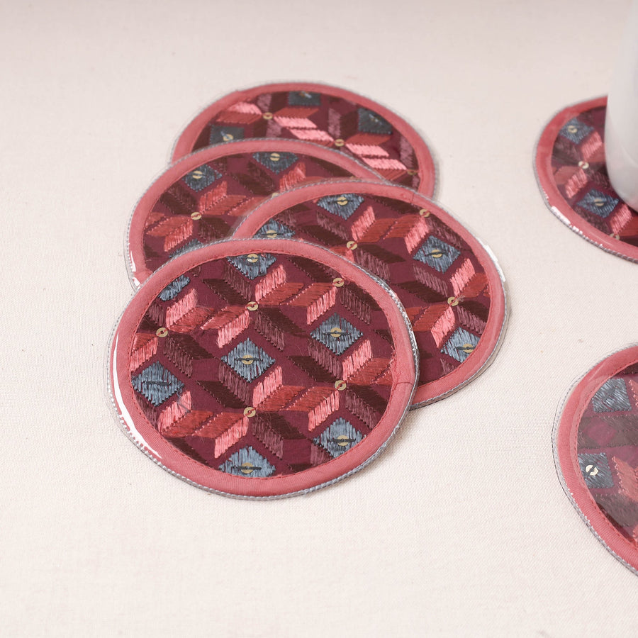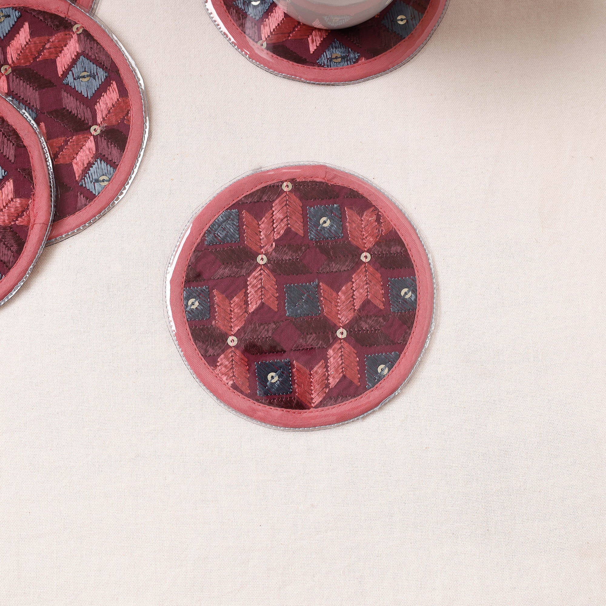 Elevate your table decor with these exquisitely handcrafted Phulkari hand embroidery laminated coasters. The word phul means flower and kari means craft. Phulkari is the art of making beautiful intricate designs and motifs on fabrics with different coloured threads. These coasters not only protect your surfaces but also showcase the artistry of Punjab's rich embroidery tradition.