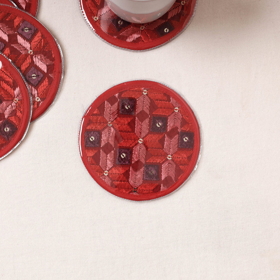 Elevate your table decor with these exquisitely handcrafted Phulkari hand embroidery laminated coasters. The word phul means flower and kari means craft. Phulkari is the art of making beautiful intricate designs and motifs on fabrics with different coloured threads. These coasters not only protect your surfaces but also showcase the artistry of Punjab's rich embroidery tradition.