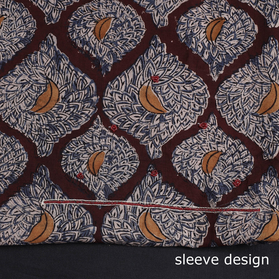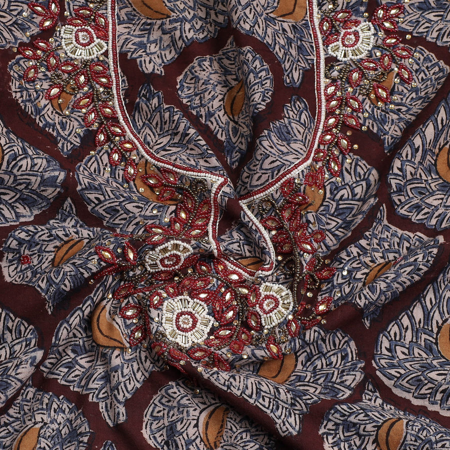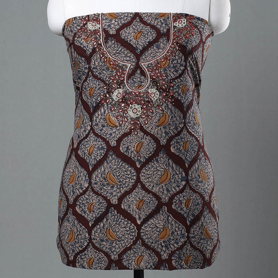 Fine quality kalamkari block printed kundan and bead work hand embroidery cotton kurta material made using natural dyes through the traditional process of hand block printing practiced by the master artisans. Kundan and beadwork embellishments are added with meticulous hand embroidery, ensuring each piece is a work of art. Perfect for crafting stunning kurtas, this kurta material allows you to embrace tradition and elegance.