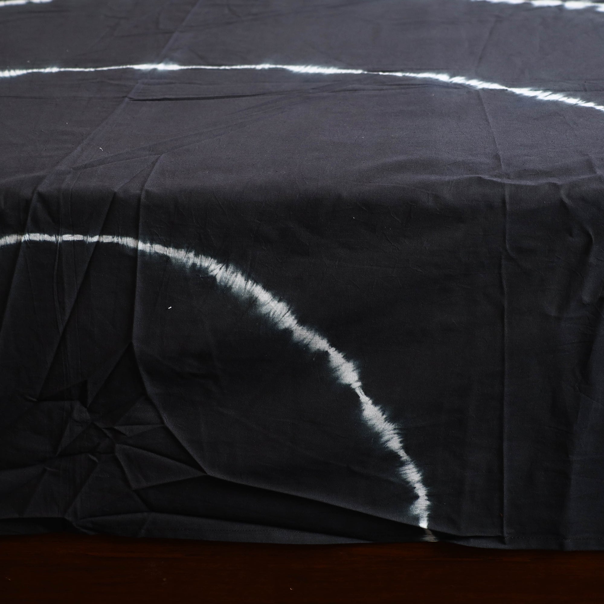 Fine quality black tie & dye cotton double shibori bed sheet set, hand dyed using shibori tie and dye technique in which the fabric is tied using clamp or stitches in the required design and the pattern is dyed. Includes matching pillow covers for a complete artisanal touch to your home.