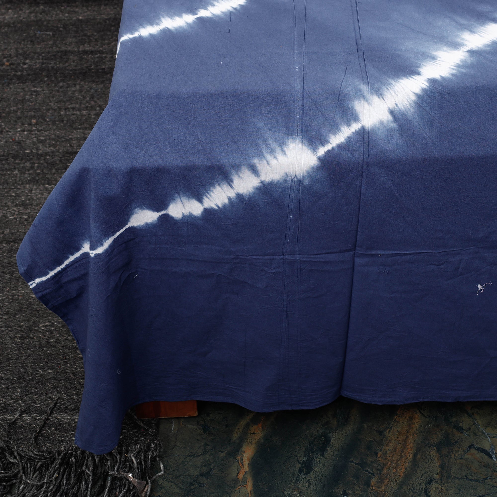 Fine quality blue tie & dye cotton double shibori bed sheet set, hand dyed using shibori tie and dye technique in which the fabric is tied using clamp or stitches in the required design and the pattern is dyed. Includes matching pillow covers for a complete artisanal touch to your home.